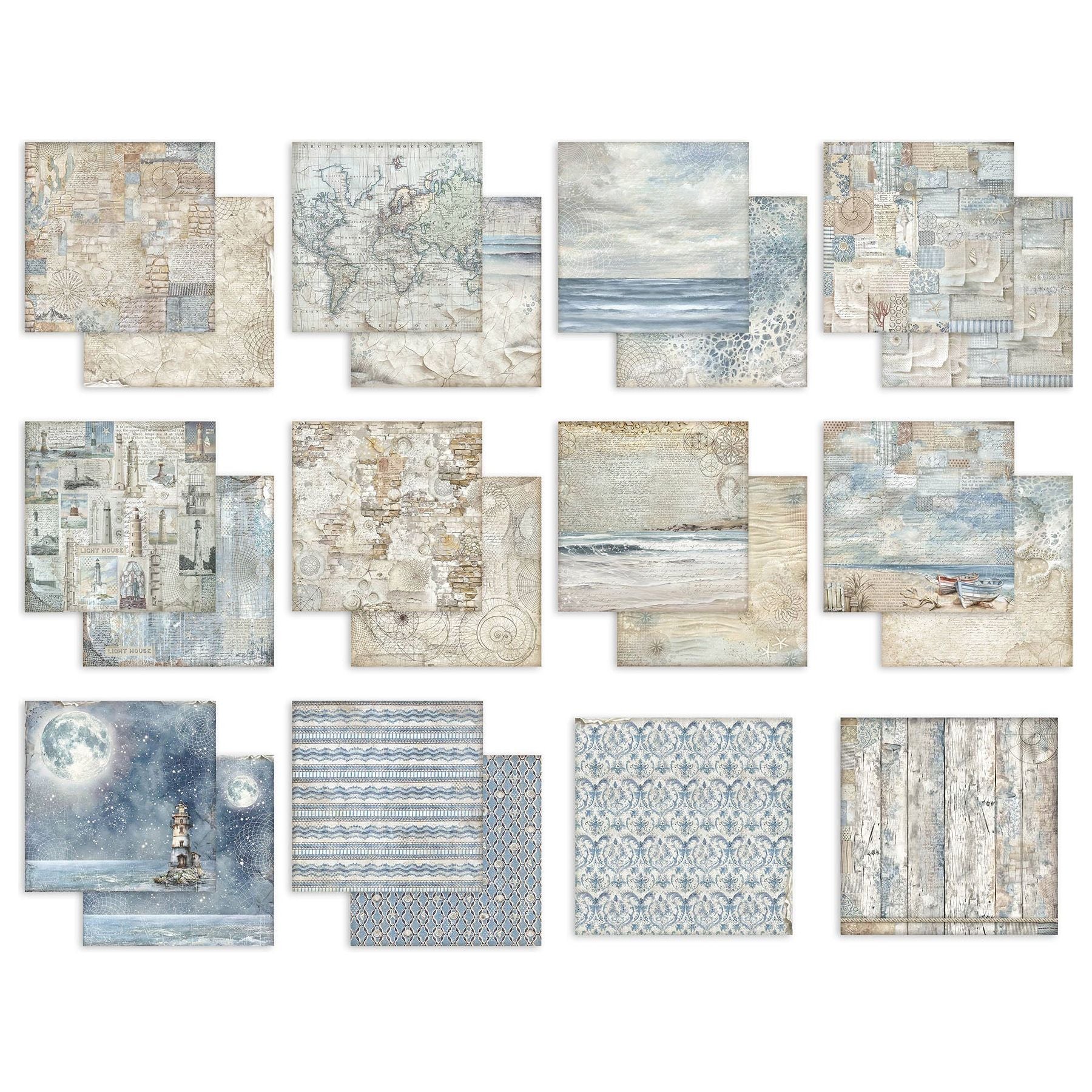 Silent Sea, designed by Cristina Radovan, captures the sea’s essence beyond the ordinary—its breeze, rhythmic waves, and the feeling of freedom it inspires. This paper pad includes ten double-sided sheets, each measuring 12 x 12 inches and made from high-quality cardstock weighing approximately 190 gsm. The designs include a variety of themes such as maps, ocean waves, lighthouses, starry skies and moons, beach scenes, and patterns like damask print, wooden slats, torn paper, cracked textures, bricks, and script.