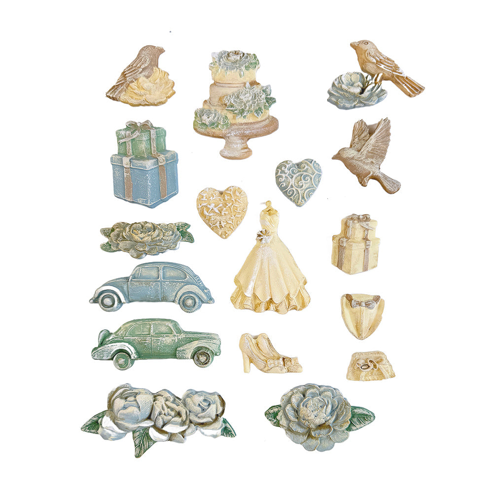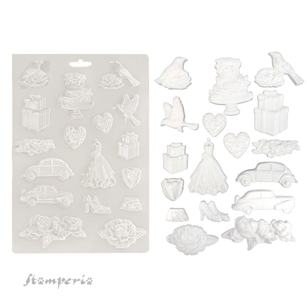 Timeless by Emilia Sieradzan, part of the Romantic Collection, is designed to cherish life’s sweetest and most intimate moments while celebrating love and charm. This versatile soft mold is ideal for use with materials like soft clay, resin, and more. Simply fill the mold, let it dry, and then remove the detailed shapes with ease. Measuring approximately 8 x 11 inches, this mold features 17 romantic and vintage-inspired designs, including birds, flowers, vintage cars, hearts, a wedding dress and part of a tuxedo, gifts, shoes, a purse, and a tiered cake. Perfect for adding dimensional embellishments to paper crafts, journals, mixed media, and wedding-themed projects.