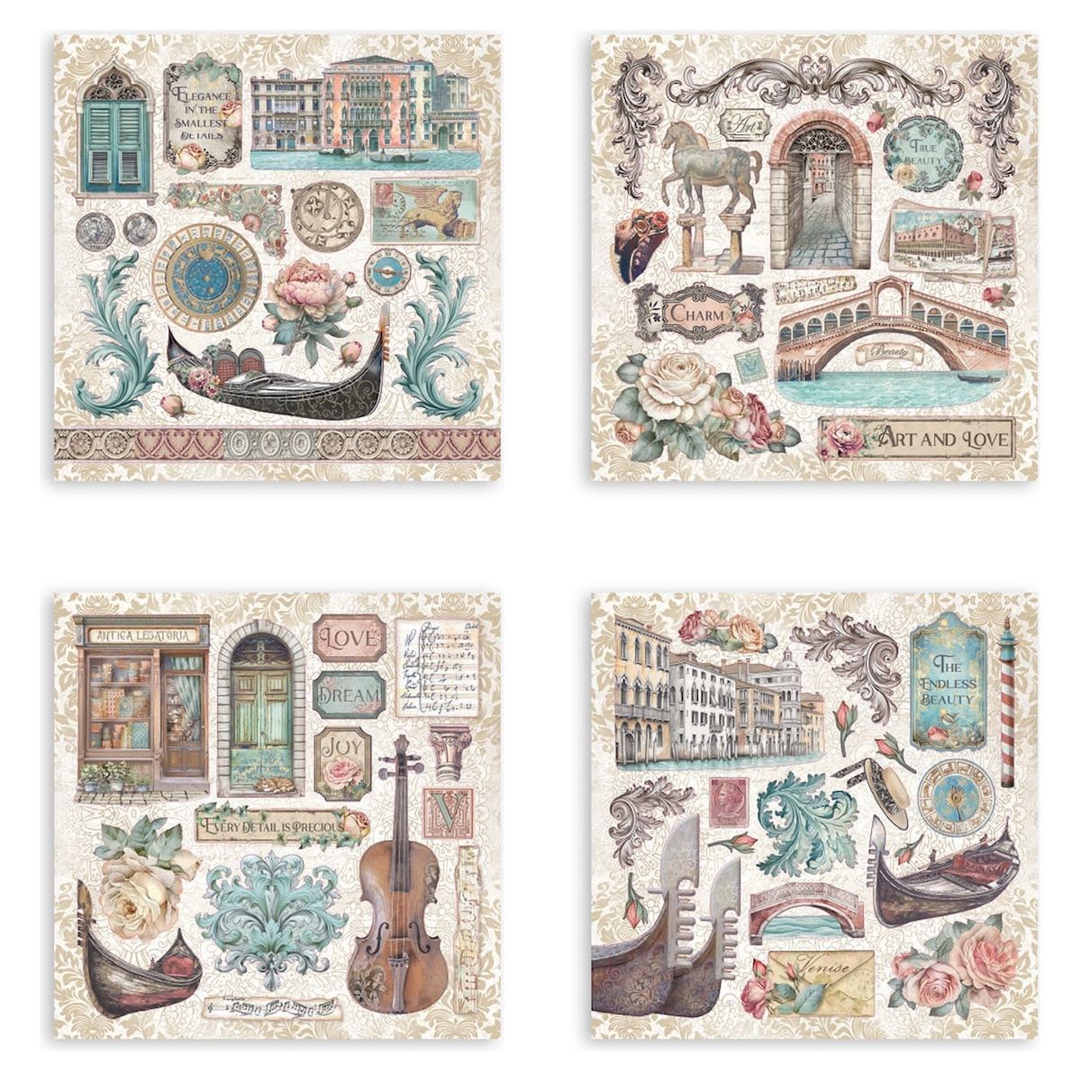 Stamperia Venice City Of Art Sticker Album was designed by Sara Alcobendas. This set includes four 6.5 x 6.5-inch sheets of pre-cut stickers, ready to use for scrapbooking, journaling, collage, and other creative projects. The designs feature horse statues, gondolas, canals, storefronts, bridges, flowers, flourishes, buildings, windows with shutters, music, and postcards, along with labels that say "Elegance is in the smallest things," "Art and Love," "Charm," "True Beauty," "Dream," and more.