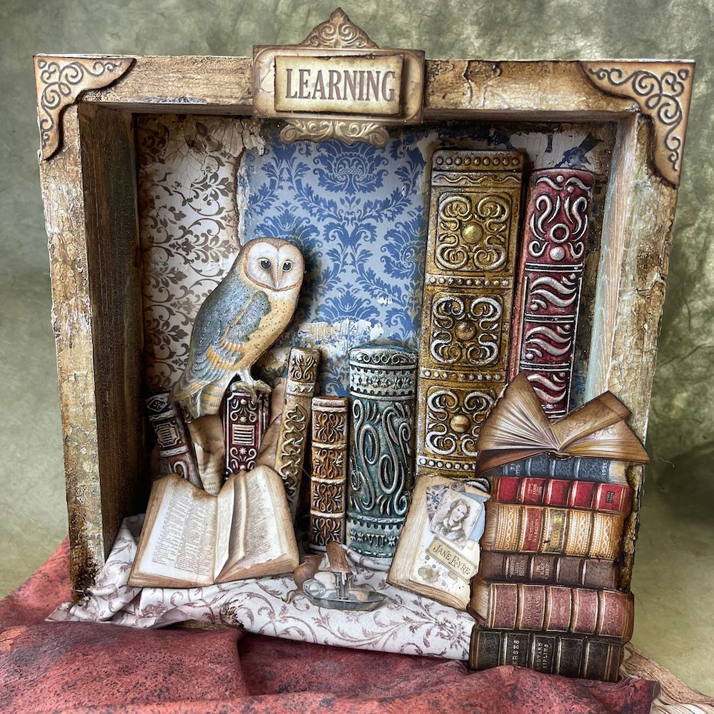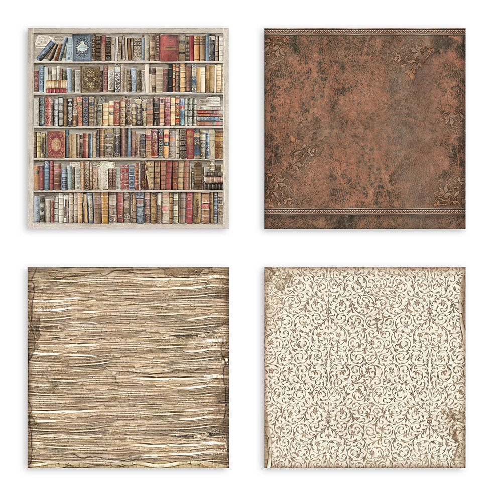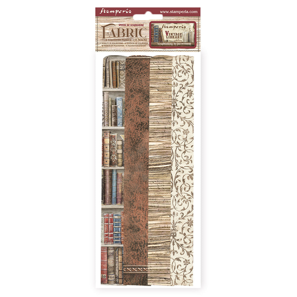 Stamperia Vintage Library Fabric Sheets feature four sheets of fabric, each measuring approximately 12x12 inches. The set showcases a variety of book-inspired designs, including a background of books on shelves, a leather book cover texture, pages, and flourishes.