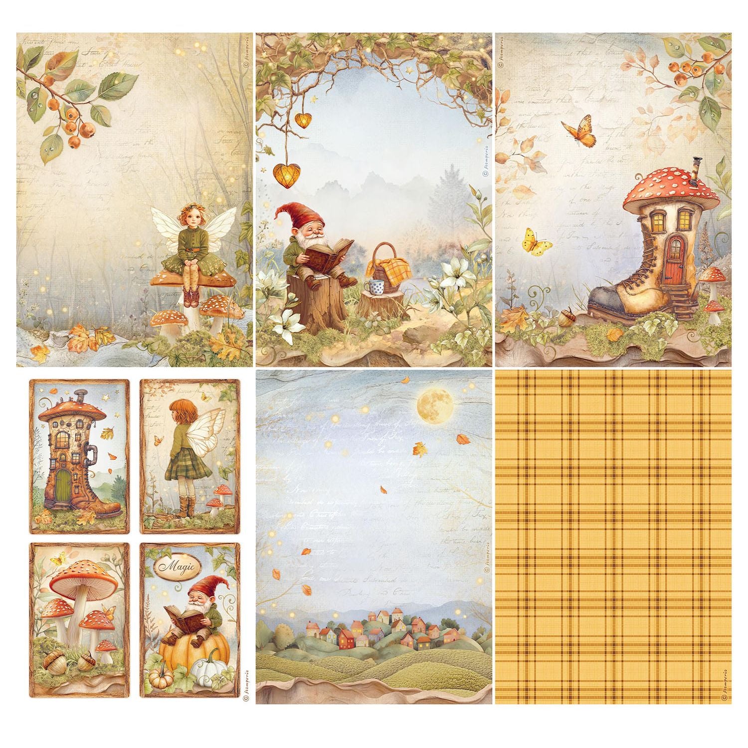 Stamperia Whispering Woods Collection, designed by Farrel Tailor for the Romantic Collection, invites you into a whimsical woodland world filled with gnomes, Frank the Frog, and enchanting natural elements. This pack includes six printed sheets of acid-free rice paper, each measuring approximately 8.3 x 11.7 inches and weighing 28 grams. These rice papers are perfect for creating captivating backgrounds for journal pages, cards, scrapbooking, mixed media, and other crafting projects. They are easy to use—simply adhere them to various surfaces with adhesive for a seamless finish. Designs feature autumn-inspired imagery such as fairies, gnomes, trees, landscapes, mushrooms, plaid, a boot home, butterflies, writing, and other natural elements.