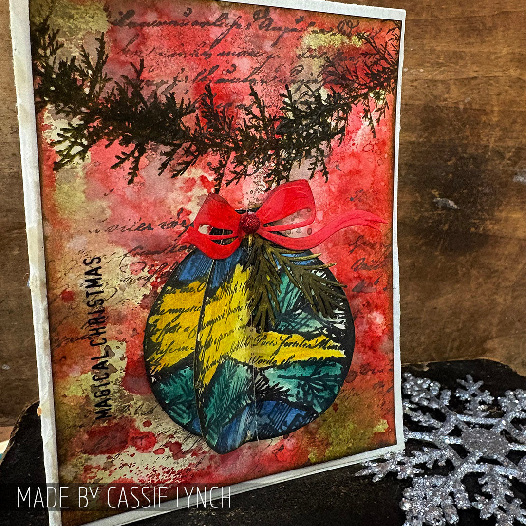 The designs include two ornaments, a gift tag, a pine branch, and a sentiment.