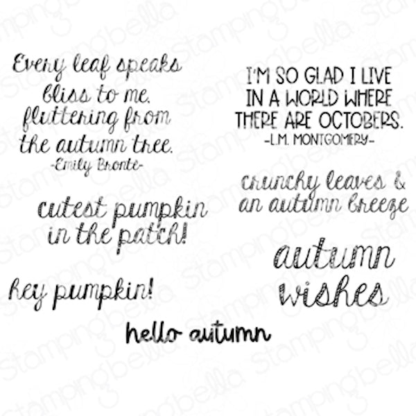 Stamping Bella Autumn Sentiment Cling Stamps feature a collection of Fall phrases. These stamps are crafted with deep etching, hand-cutting, and secure mounting on cling foam. The set measures 5x4 inches and includes seven stamps. Discover the beauty of the following autumnal sentiments: