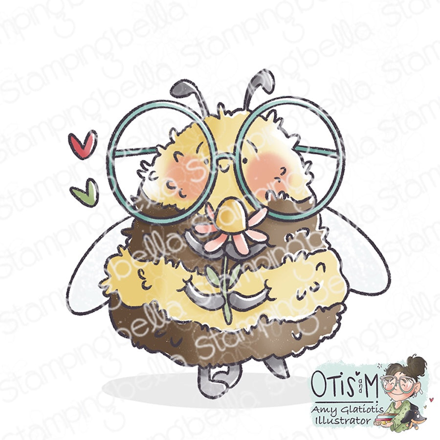 Stamping Bella Buzzy Bee Holding a Flower Cling Stamp is mounted on cling foam, deeply etched, and hand-cut to ensure a top-quality impression every time. Illustrated by Otis and M (Amy Glatiotis), this 5 x 4-inch stamp set includes one whimsical image of a cute bee wearing large glasses and holding a tiny flower. Perfect for adding a sweet, playful touch to your crafting projects.