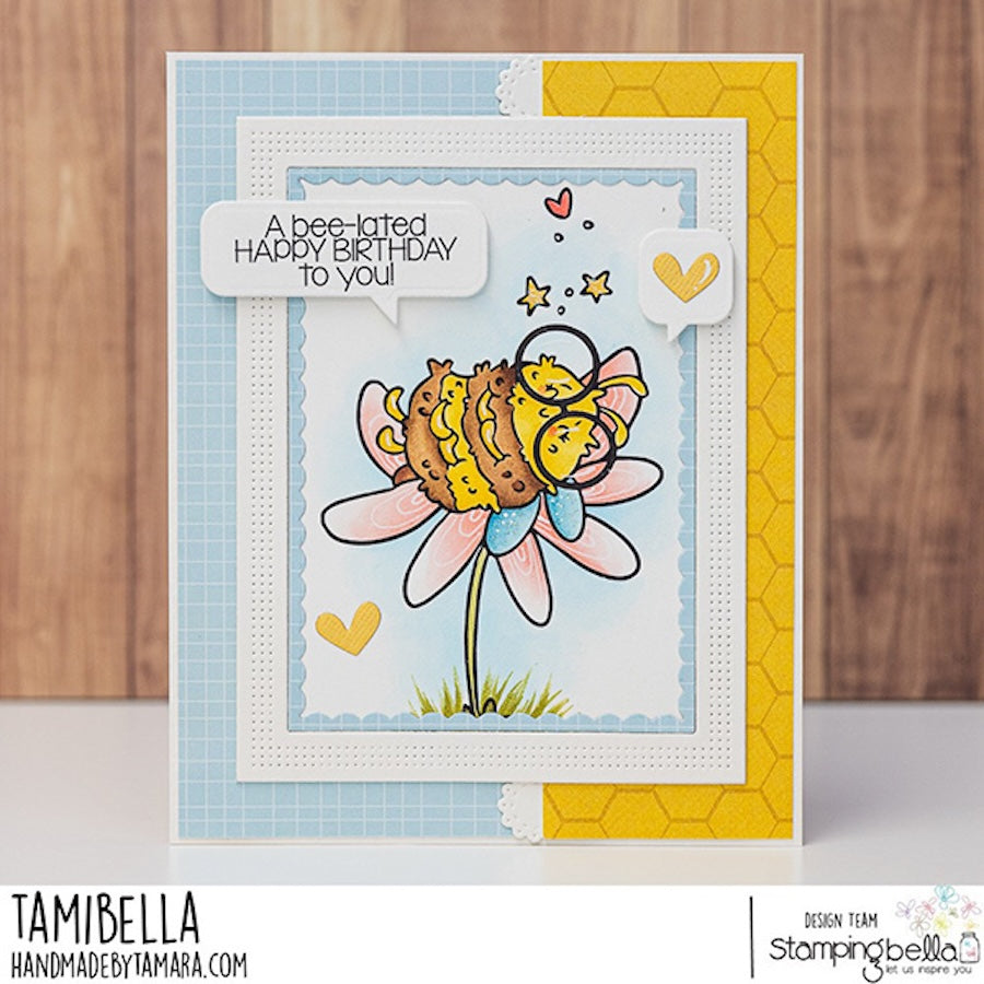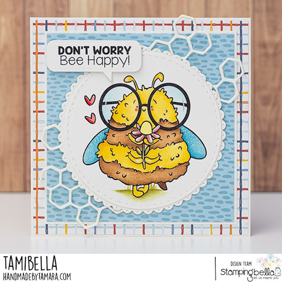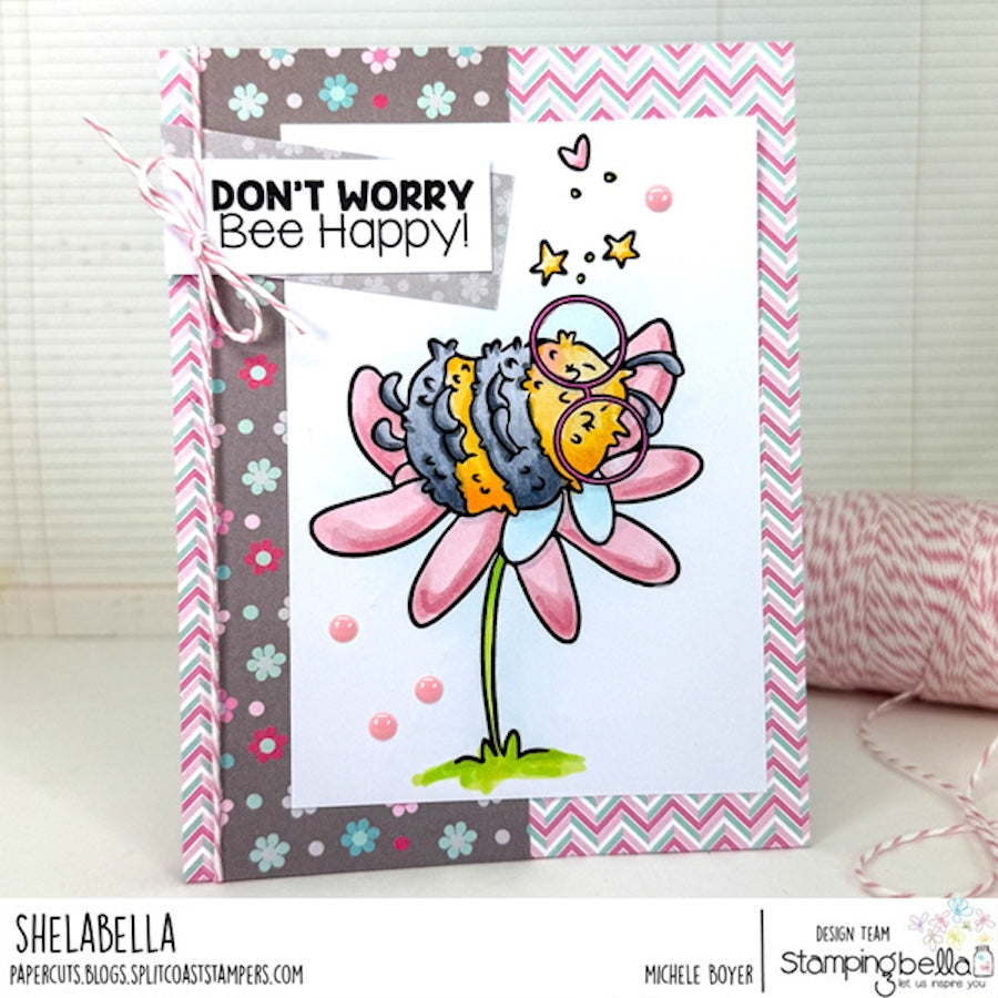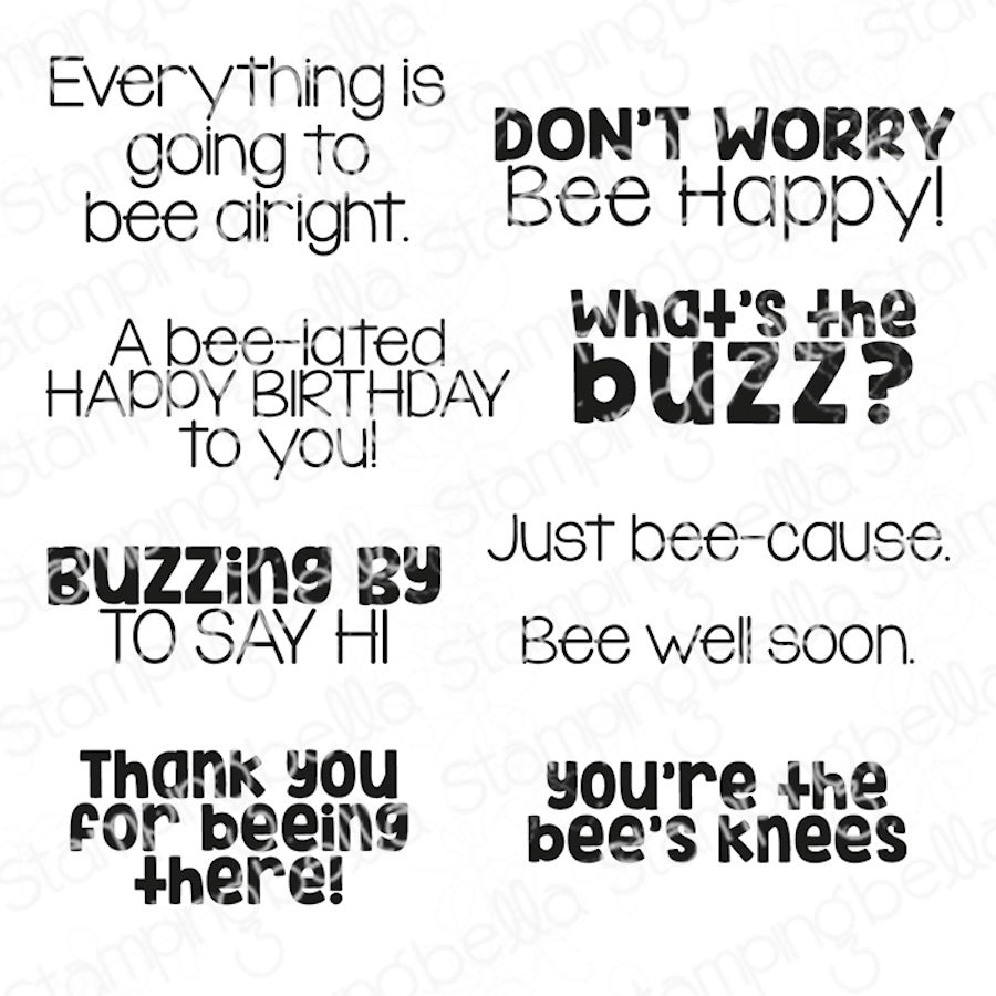Stamping Bella Buzzy Bee Sentiment Cling Stamps are mounted on cling foam, deeply etched, and hand-cut to ensure a top-quality impression every time. Measuring 5 x 4 inches, this stamp set includes 9 fun and playful sentiments: "Everything is going to bee alright," "Don’t worry Bee happy," "A bee-lated happy birthday to you," "What’s the buzz," "Buzzing by to say hi," "Just bee-cause," "Bee well soon," "Thank you for beeing there," and "You’re the bee’s knees." These sentiments work wonderfully with all Stamping Bella Buzzy Bee stamps, adding a cheerful touch to your projects.