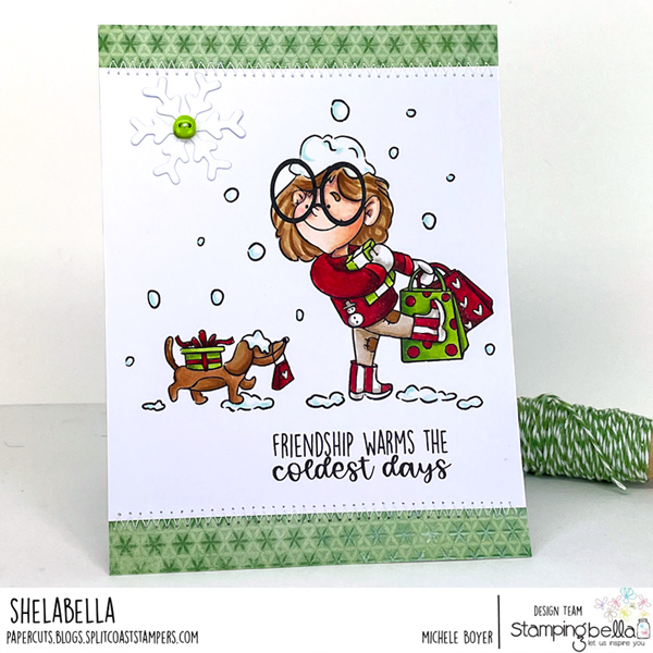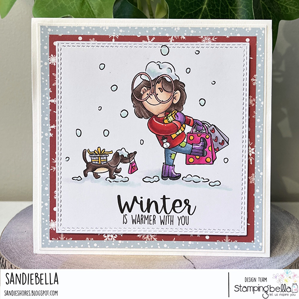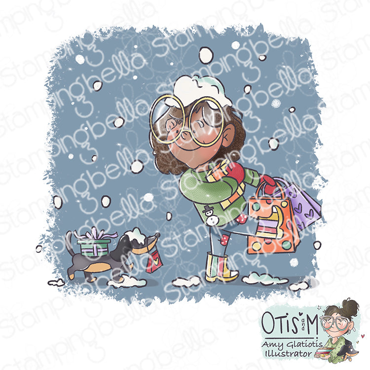 The Stamping Bella Christmas Shopping Pals Cling Stamp is perfect for adding a festive touch to your holiday-themed cards. Illustrated by Otis and M (Amy Glatiotis), these cling stamps are mounted on cling foam, deeply etched, and hand cut for a top-quality impression every time. Measuring 5 x 4 inches, the stamp features a girl dressed in winter clothes and large glasses, holding bags of presents, with her dog following behind, carrying a present on its back. This charming design is perfect for capturing the holiday shopping spirit in your crafting projects!