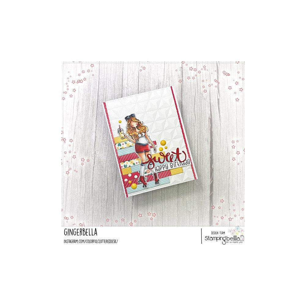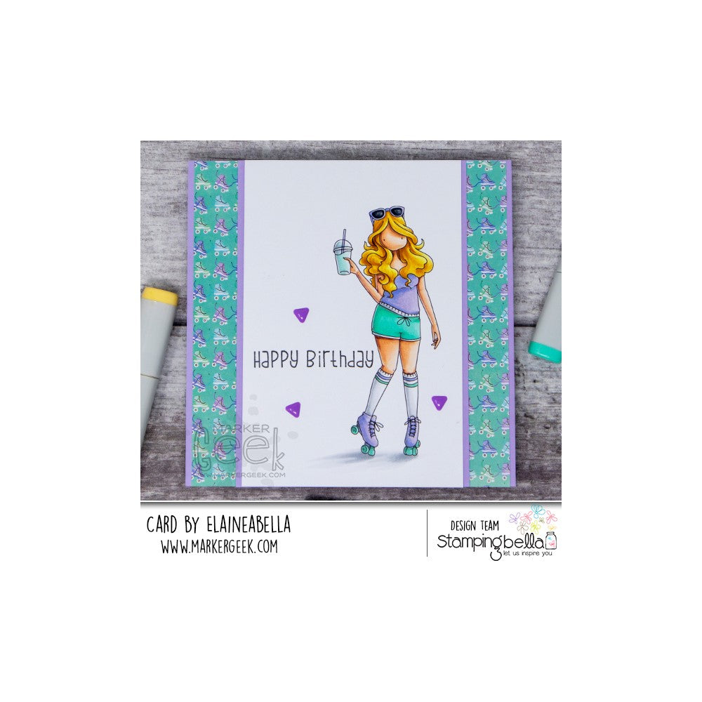 The Stamping Bella Curvy Girl Loves To Roller Skate Cling Stamp is a fun design that brings back memories of youth. The cling stamp is mounted on cling foam, deeply etched, and hand-cut for a high-quality impression every time. The 5x4 stamp set includes one stamp featuring a girl wearing shorts and a shirt, with long hair flowing and sunglasses on her head. She has roller skates on her feet, a drink in one hand, and looks ready to have some fun.
