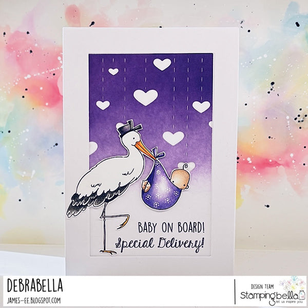 The Stamping Bella Delivery from the Stork Cling Stamp features a deeply etched design with precise hand-cutting, securely mounted on cling foam for effortless stamping. This 5 x 4-inch stamp set includes one image of a stork wearing a cap, carrying a sack with a precious baby inside.