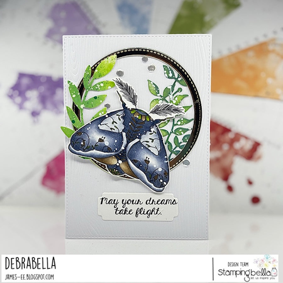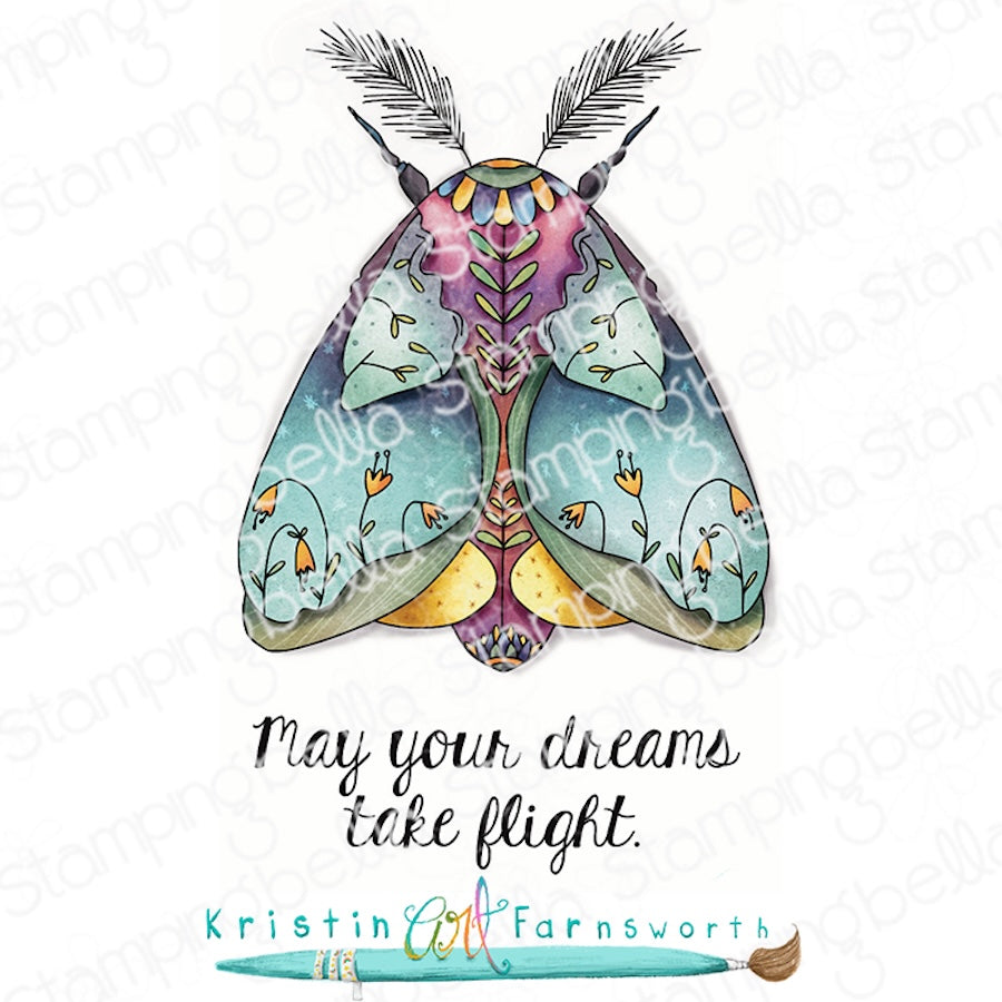 Stamping Bella Garden Mantle Moth Cling Stamps are mounted on cling foam, deeply etched, and hand-cut to ensure a top-quality impression every time. Illustrated by Kristin Farnsworth, this 5 x 4-inch stamp set includes 2 pieces: a moth with flower imagery in its wings and the sentiment "May Your Dreams Take Flight." Perfect for adding a delicate, nature-inspired touch to your crafting projects.