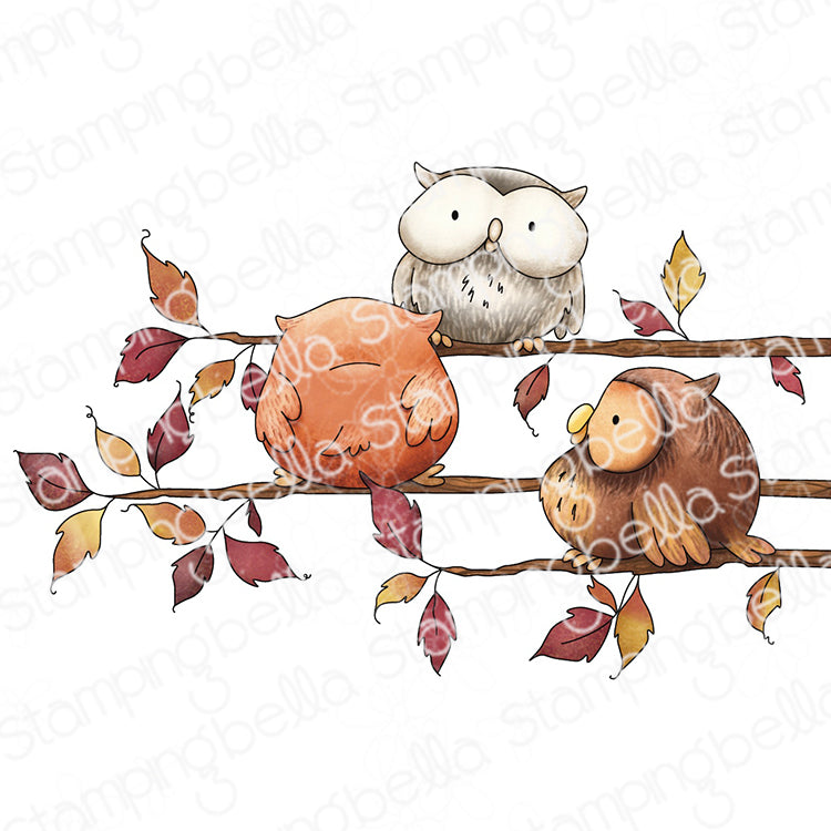 Stamping Bella Little Owl Trio Cling Stamp is mounted on cling foam, deeply etched, and hand-cut to ensure a crisp impression every time. Measuring 5 x 4 inches, this set includes 1 stamp featuring three adorable owls perched among branches with fluttering autumn leaves. One owl peeks from above while the others sit contentedly below, creating a cozy woodland scene. Perfect for fall cards, Thanksgiving journaling, or holiday nature-inspired crafts. Stamp measures approximately 4 x 2.5 inches.
