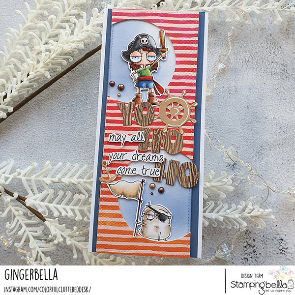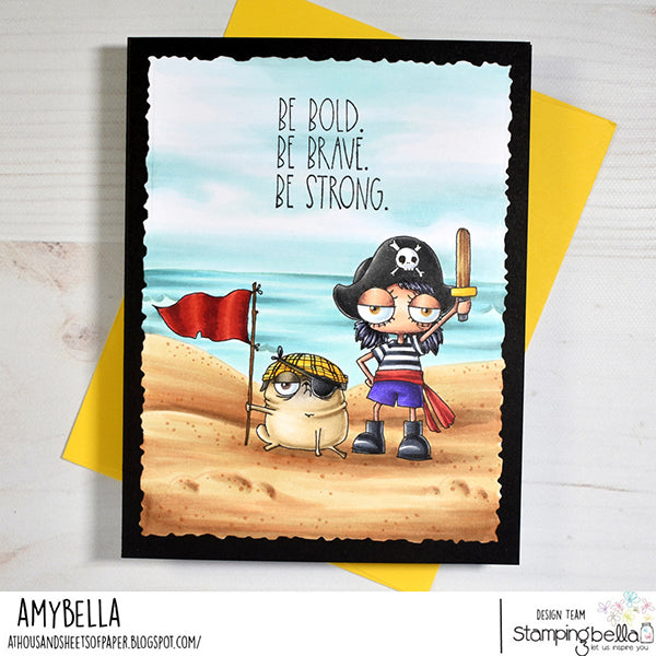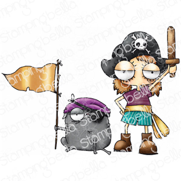 Stamping Bella Mini Oddball Pirate & Pug Cling Stamp is a charming creation. This stamp is crafted with deep etching, precise hand-cutting, and secure mounting on cling foam. The stamp set measures 5x4 inches and includes one delightful design. Picture a young girl dressed as a pirate, complete with boots, hats, a belt, and a wooden sword, accompanied by her trusty dog. The pug sports a bandana and an eye patch and proudly holds a flag. Perfect all year long or Halloween.