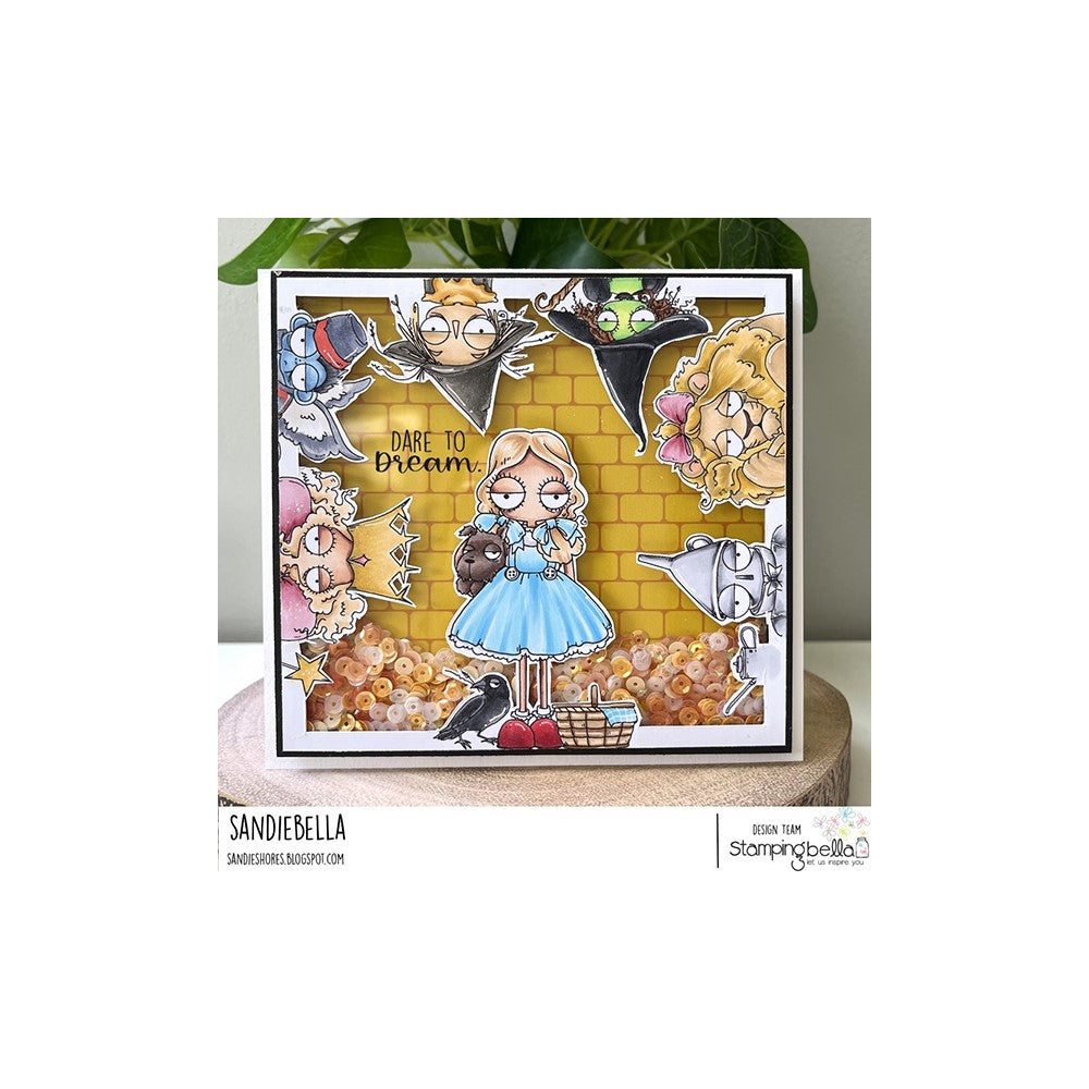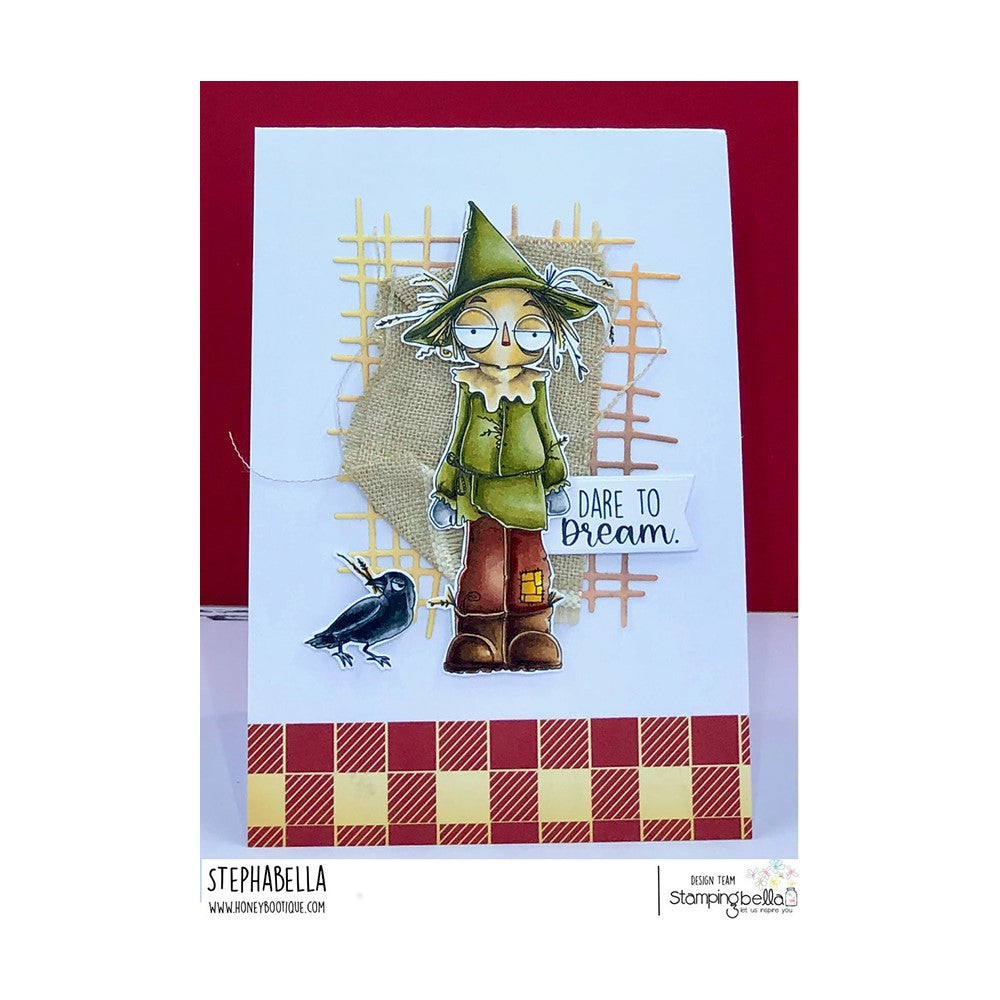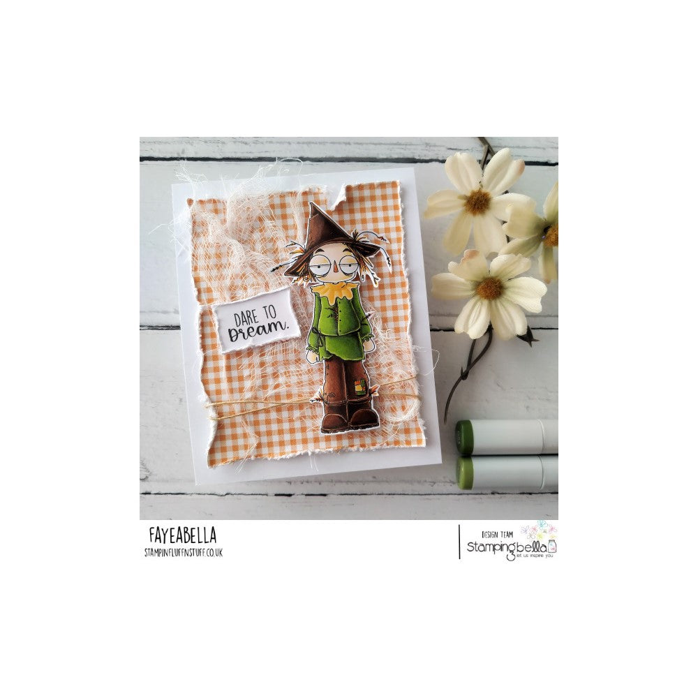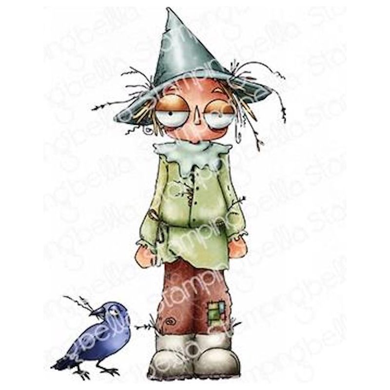 The Stamping Bella Oddball Oz Scarecrow cling stamp features a whimsical design of the Scarecrow from the Wizard of Oz, complete with his hat and straw sticking out, while a friendly crow sits next to him.