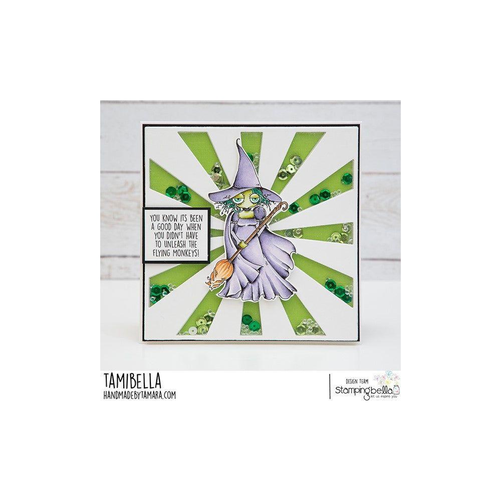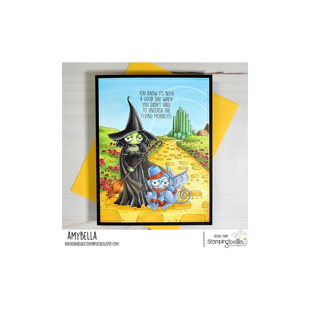 The Stamping Bella Oddball Oz Wicked Witch Cling Stamp features a unique and whimsical design of the Wicked Witch from the Wizard of Oz, still standing and ready to fly on her broomstick.