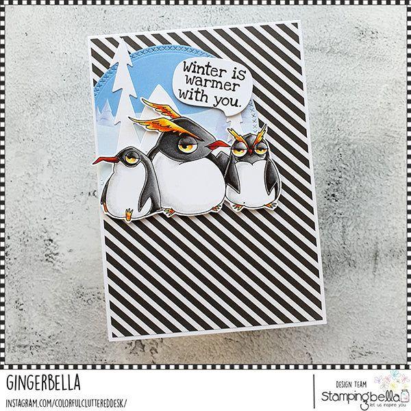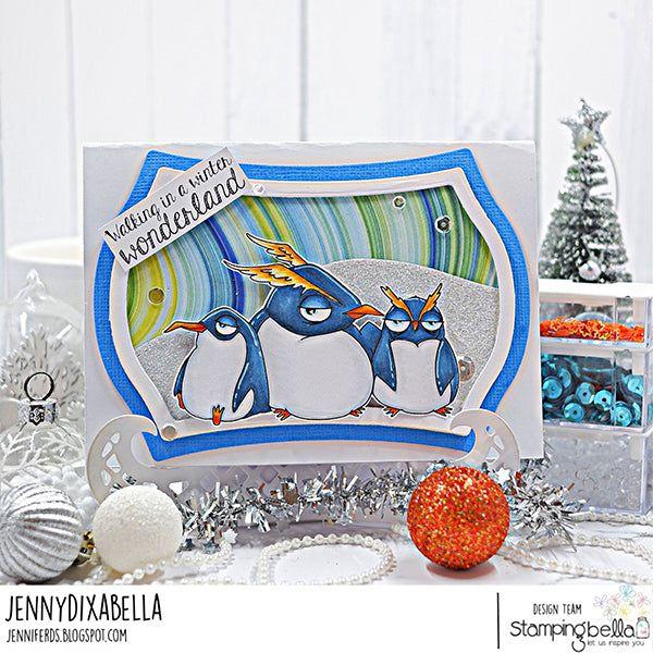 Stamping Bella Oddball Penguin Trio Cling Stamp showcases a whimsical winter scene. This stamp is crafted with deep etching, precise hand-cutting, and secure mounting on cling foam. The stamp set measures 5x4 inches and includes 1 stamp. In this fun design, a trio of chunky penguins, with their raised eyebrows or crests, are looking slyly, adding a touch of seasonal whimsy to your projects.