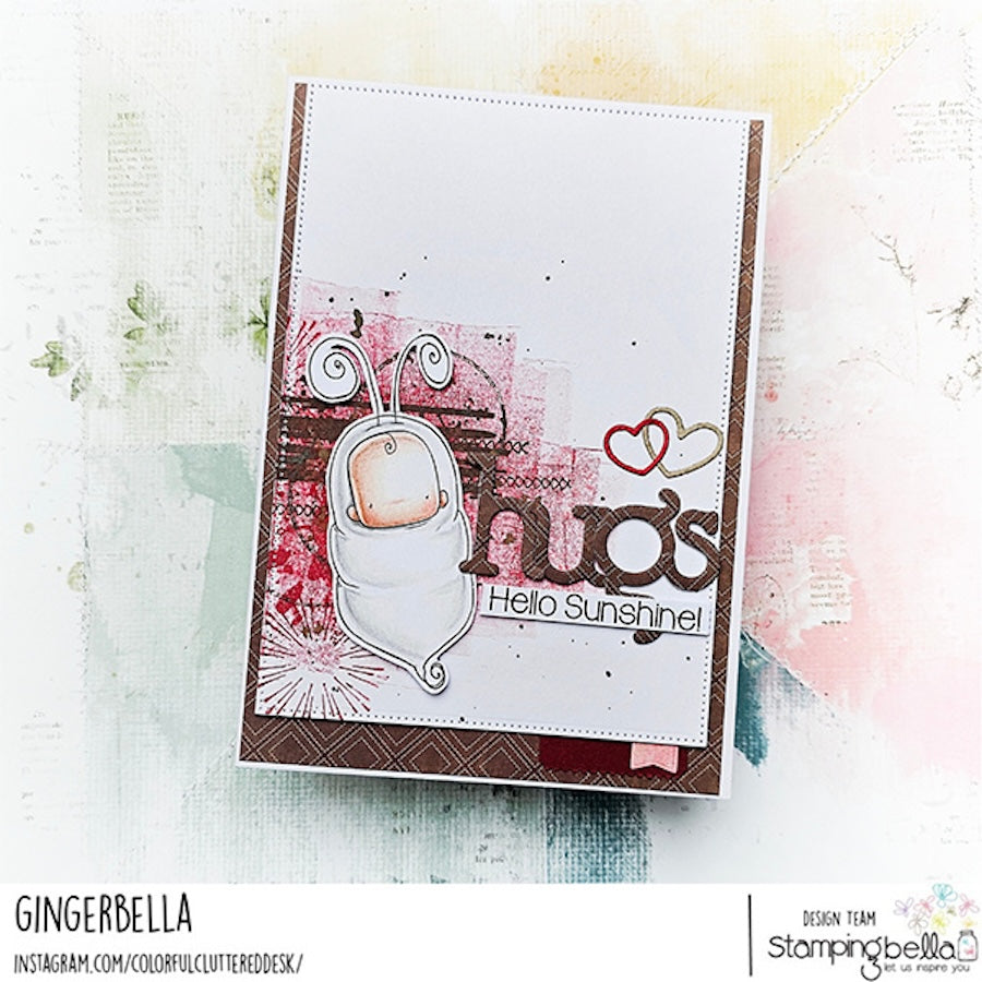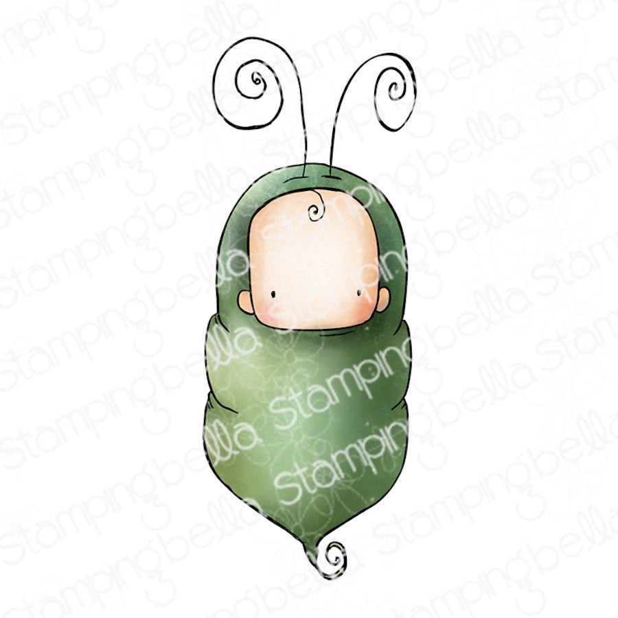 Stamping Bella Pupa Baby Cling Stamp is mounted on cling foam, deeply etched, and hand cut to ensure a top-quality impression every time. Measuring 5 x 4 inches, this stamp set includes 1 stamp featuring a little baby wrapped in a cocoon with antennae. Perfect for adding a cute and imaginative touch to your crafting projects.