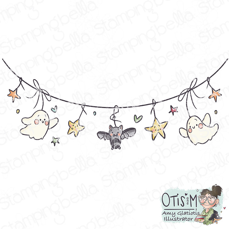 The Stamping Bella Spooky Cute Banner Cling Stamp is perfect for adding a playful touch to your Halloween-themed cards. Illustrated by Otis and M (Amy Glatiotis), these cling stamps are mounted on cling foam, deeply etched, and hand-cut for a top-quality impression every time. Measuring 5 x 4 inches, this stamp features a charming banner with stars, ghosts, and bats hanging from it, making it a delightful addition to your spooky crafting projects.