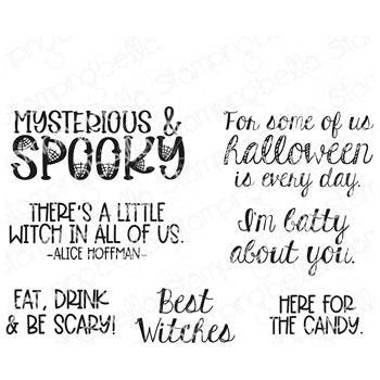 Stamping Bella Spooky Sentiment Cling Stamps feature a collection of eerie expressions perfect for Halloween. These stamps are crafted with deep etching, hand-cutting, and secure mounting on cling foam. This stamp set measures 5x4 inches and includes a total of seven stamps. Enjoy these hauntingly delightful sentiments: