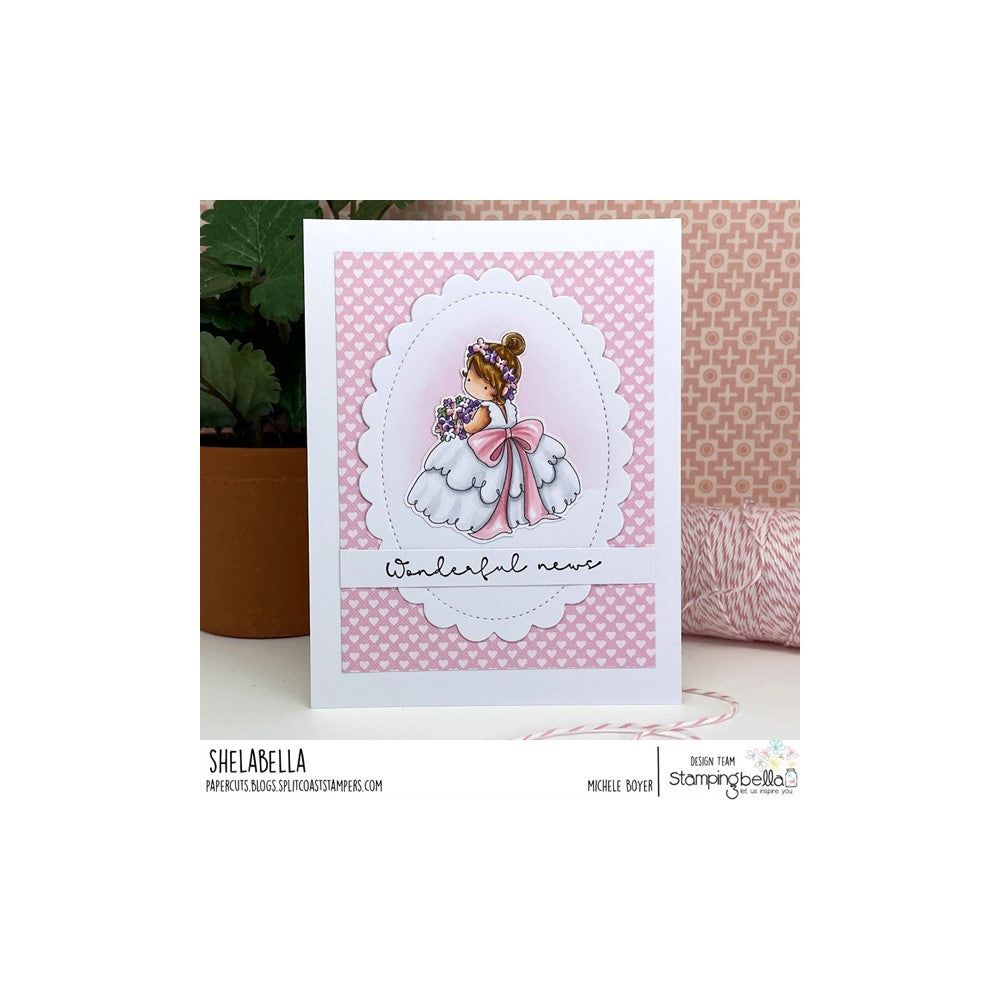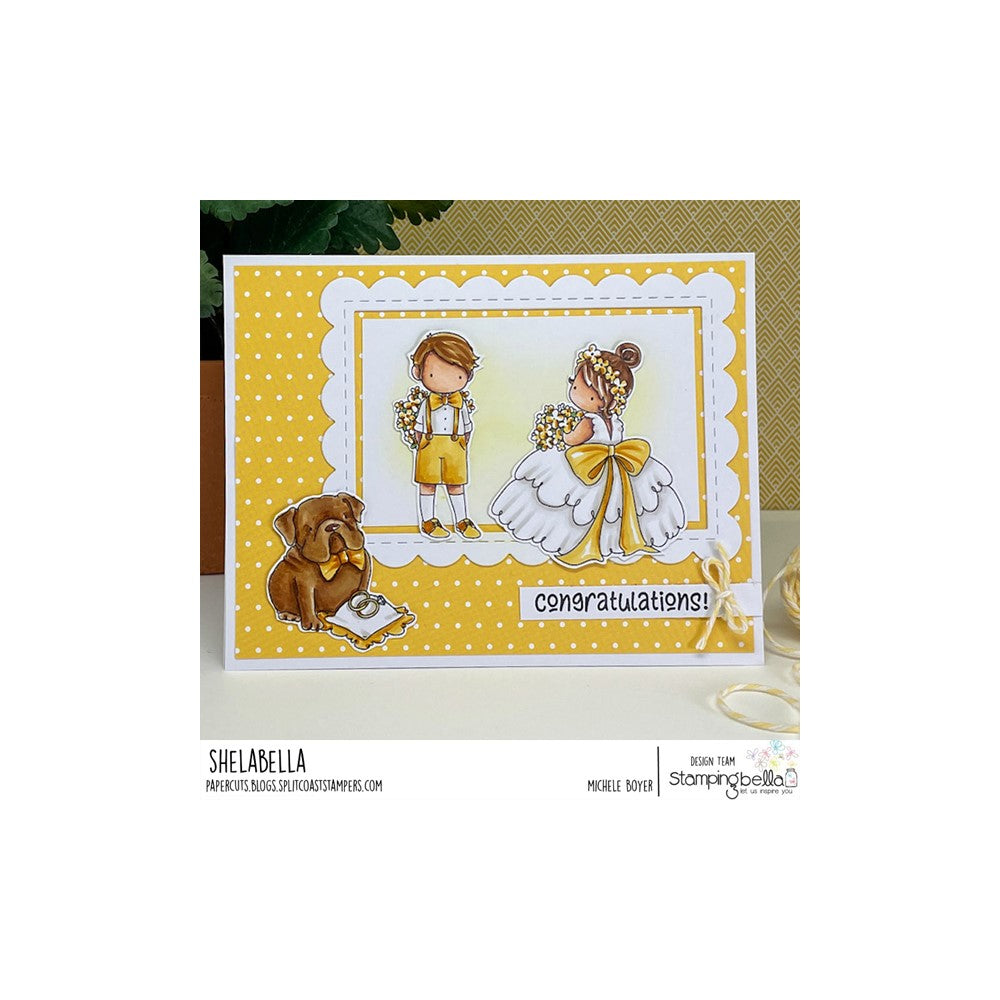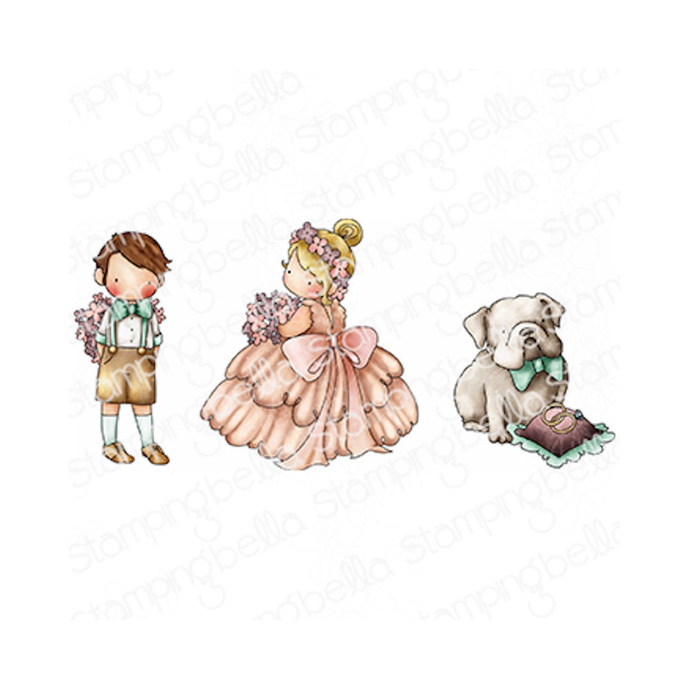 The Stamping Bella Tiny Townie Wedding Trio Cling Stamps set features three top-quality stamps, including a cute little boy in shorts, bow tie, and suspenders holding a bouquet of flowers behind his back. A young girl is also included, dressed in a full, ruffled dress, hair up with a crown of flowers and holding a bouquet. Lastly, there is a bulldog sitting next to a pillow with rings, ready to be the ring bearer.