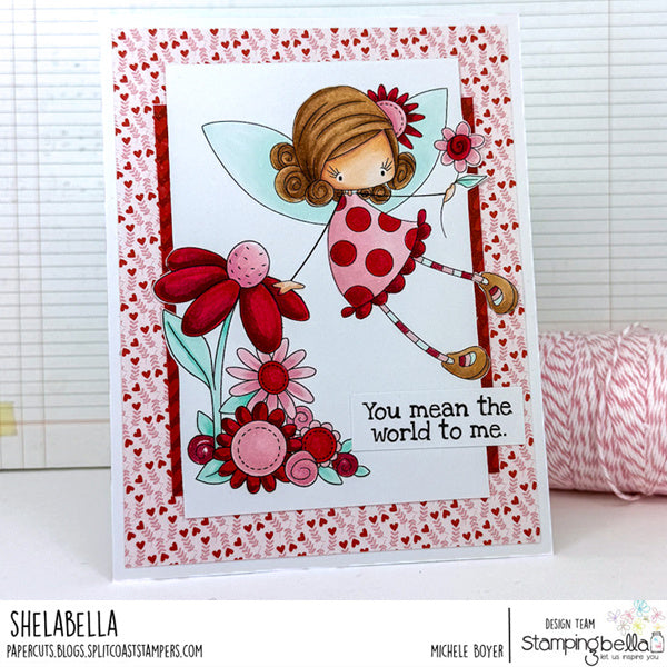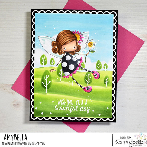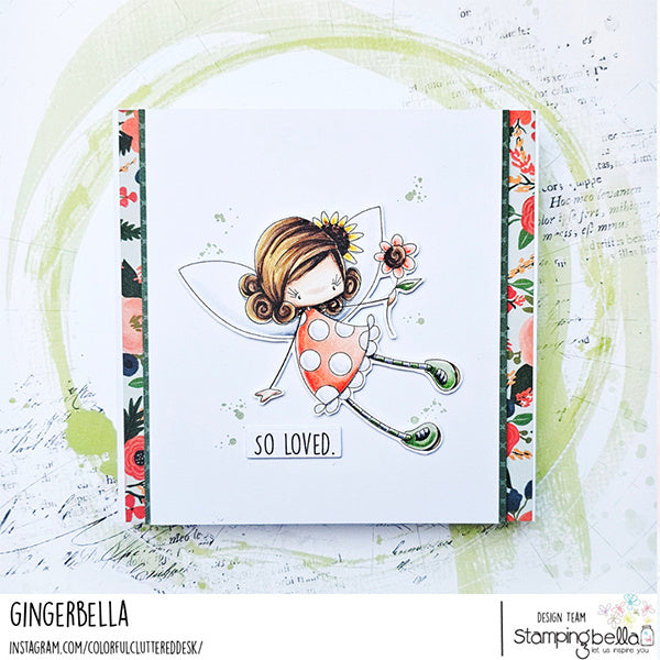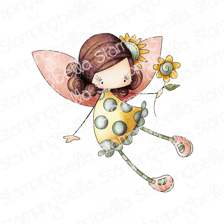 The Stamping Bella Whimsabella PetalShimmer Cling Stamp features a deeply etched design with precise hand-cutting, securely mounted on cling foam for effortless stamping. This 5 x 4-inch stamp set includes one image of a delightful fairy girl in a polka dot dress, gently holding a single flower.