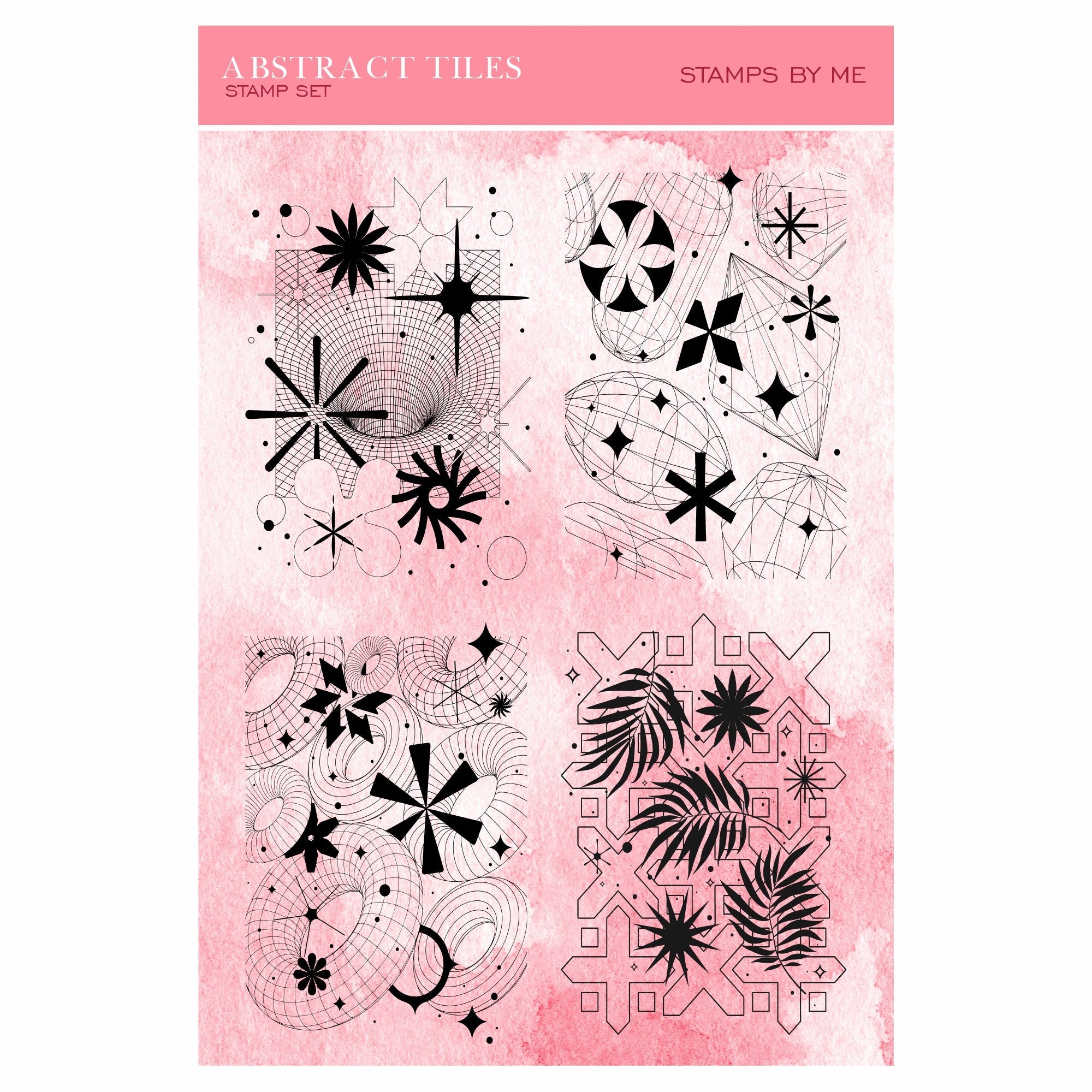 The Stamps By Me Abstract Tiles Clear Stamps include four distinct tile designs, each measuring approximately 3.75 x 2.75 inches. The designs feature a variety of geometric and abstract patterns, such as optical illusions, starbursts, pinwheels, gemstone outlines, fronds, and other unique shapes, making them perfect for adding visual interest to your projects.