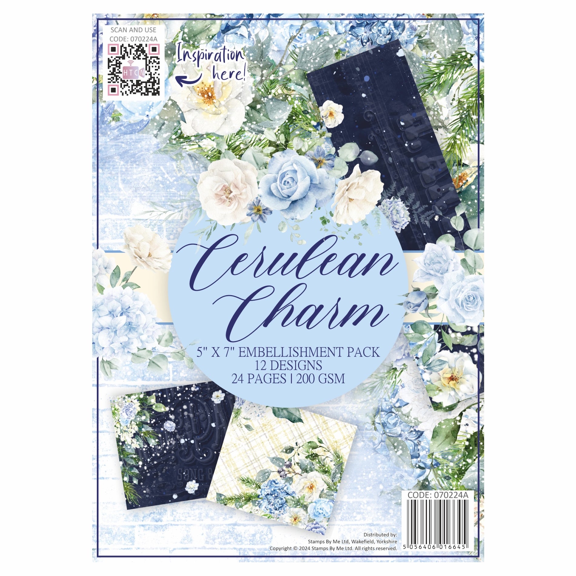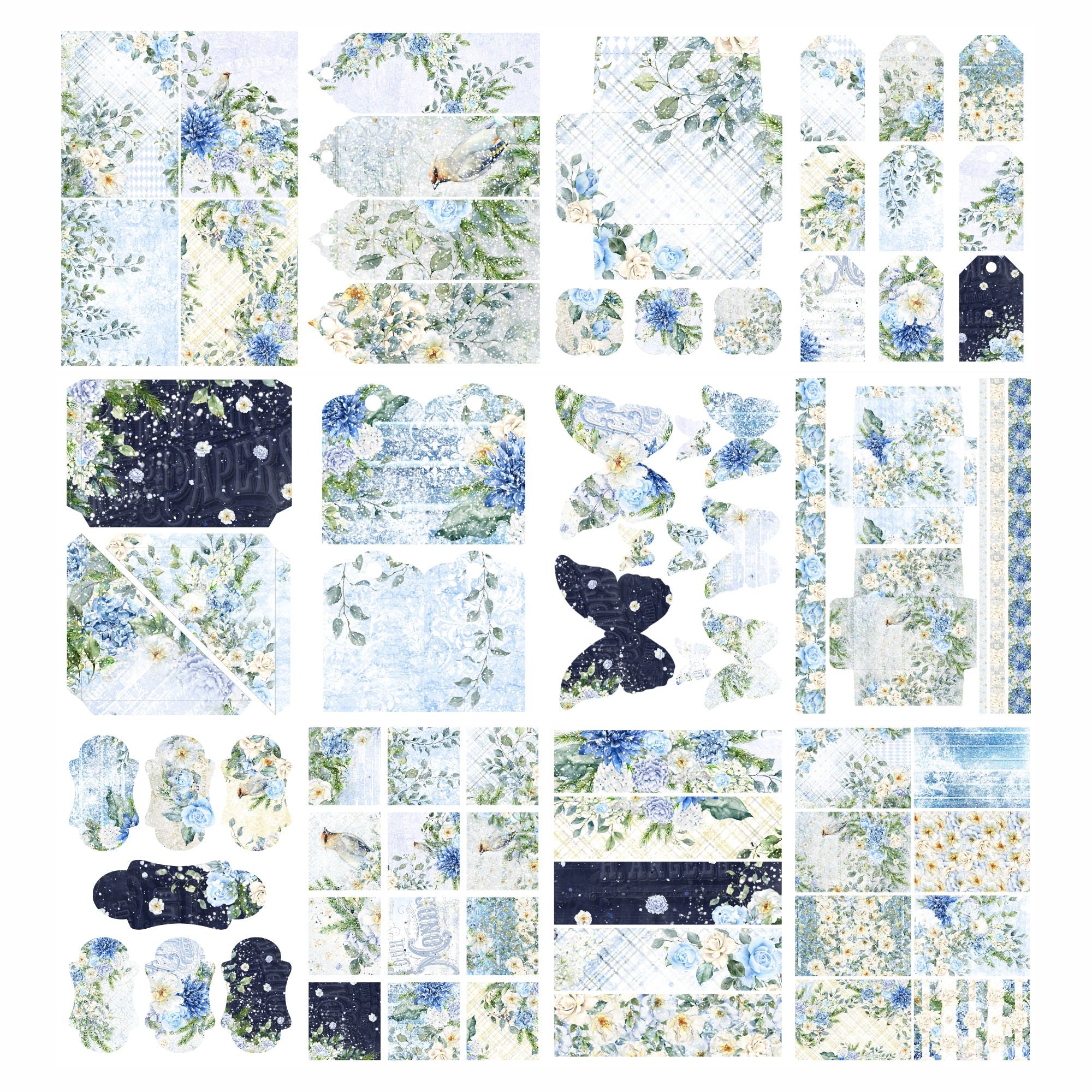 The Stamps By Me Cerulean Charm Embellishment Pack features corner and regular pockets, butterflies, bookmarks, notecards, tags, labels, borders, envelopes, and more—each adorned with beautiful imagery of flowers, foliage, and birds in soft blues and creams. This pack includes 24 single-sided sheets across 12 unique designs, printed on premium 200gsm paper, with each sheet measuring approximately 5 x 7 inches.