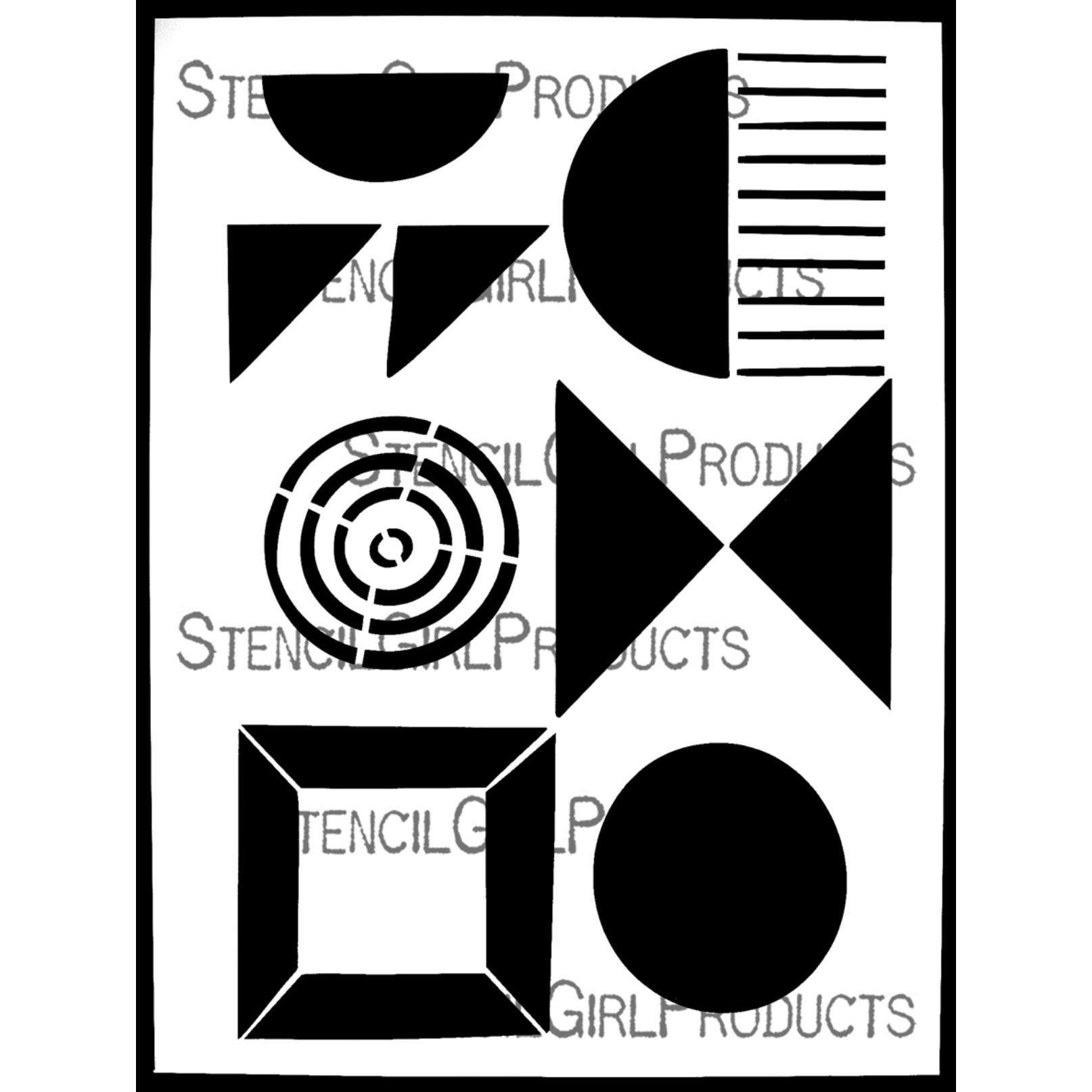 The StencilGirl Bauhaus 3 Stencil, designed by Mary Beth Shaw, showcases a striking mix of abstract shapes including arcs, concentric circles, triangles, and linear elements. Measuring 9 x 12 inches, this stencil brings a bold, modernist aesthetic to your mixed media projects, collage work, and art journaling. Made in the USA from sturdy mylar for repeated use.