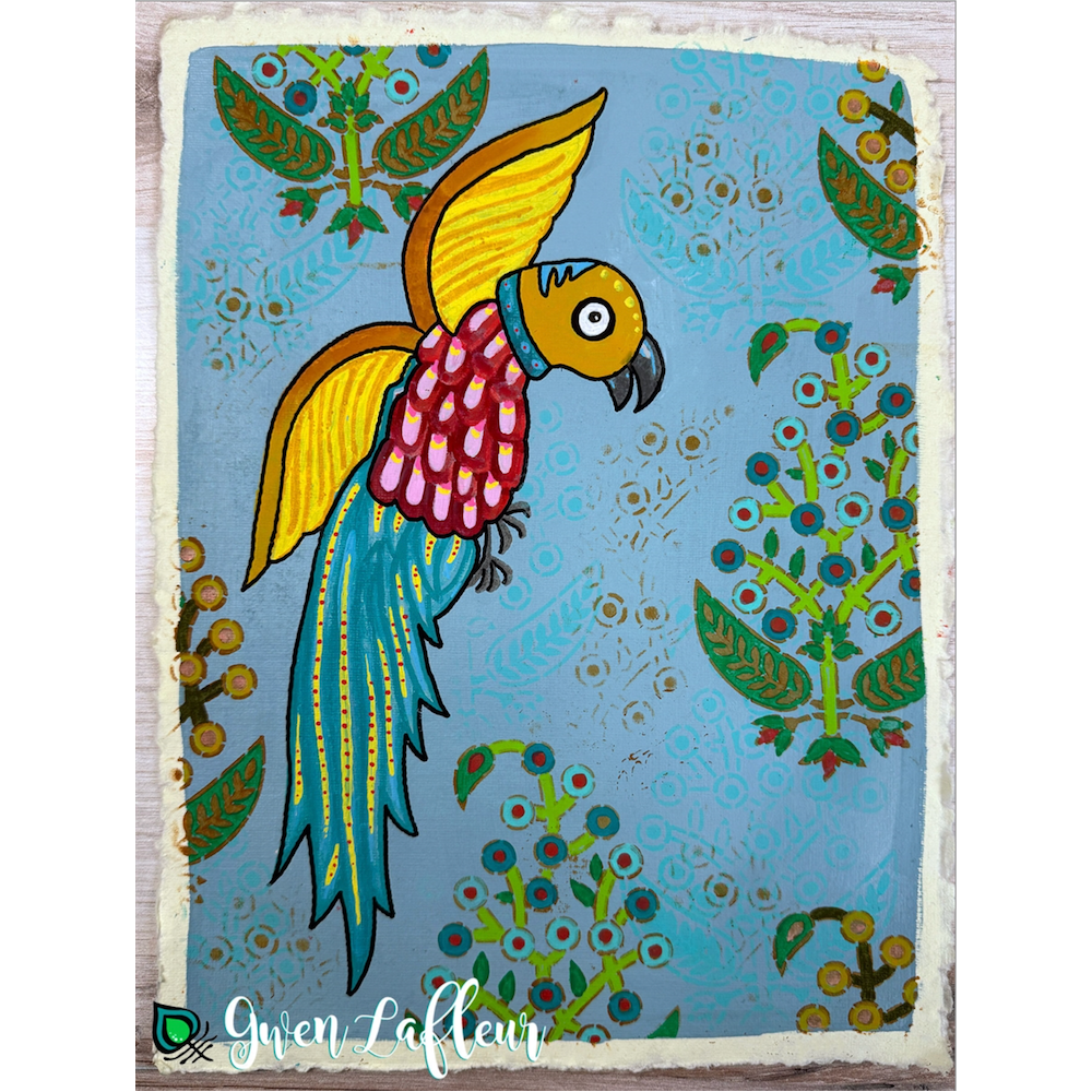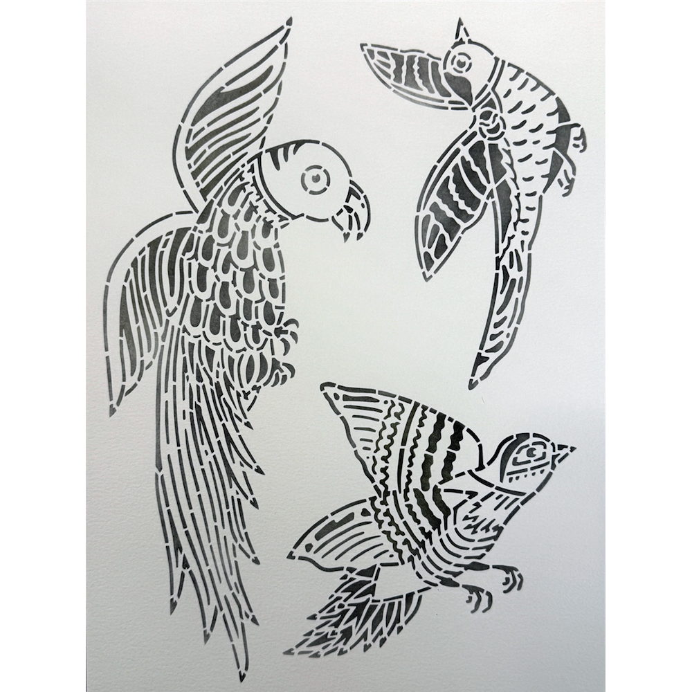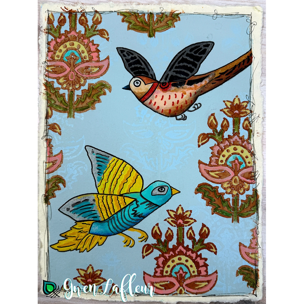 The Block Print Birds stencil by Gwen Lafleur brings the beauty of Indian block print style to your projects with a large parrot and two smaller songbirds, offering three designs in one versatile stencil. Inspired by Gwen’s love of birds and Indian textile artistry, this 9 x 12 inch stencil is perfect for mixed media, art journaling, scrapbooking, and more. Use with ink, paint, markers, texture pastes, or molding mediums to create stunning, intricate designs.