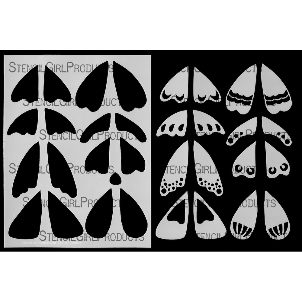 The StencilGirl Moth Parts Stencil by Sarah Gardner is a 9 x 12 inch stencil and mask set designed for creating layered moth wings in mixed media projects. Use the components to stencil, trace, or cut out shapes for dynamic wing effects. Great for building dimensional moths from painted or patterned art papers. Some disassembly required. Made in the USA.
