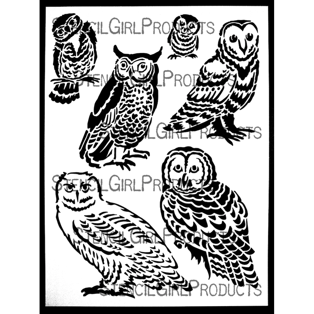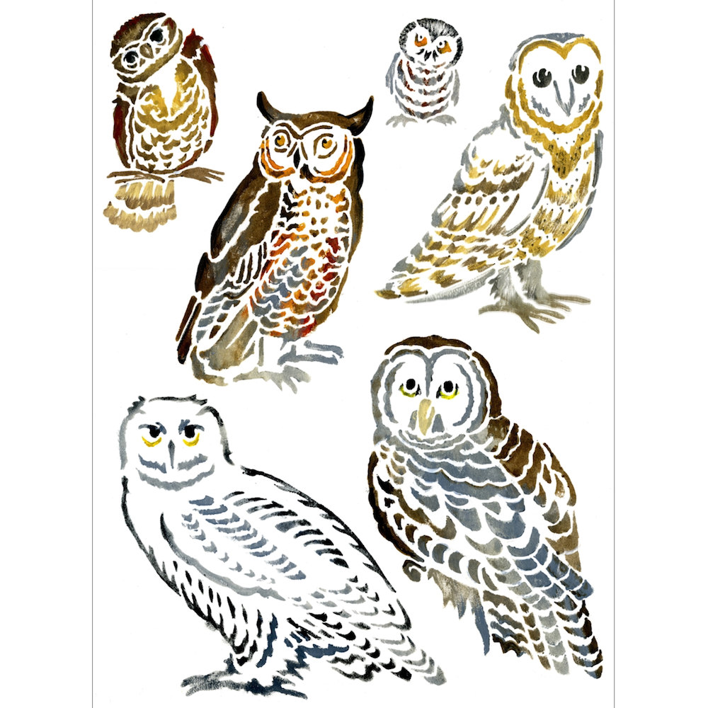 The StencilGirl Poet Owls Stencil, designed by Margaret Peot, captures the enchanting essence of owls that have been a significant part of her life. Margaret shares, 'Owls were a big part of my growing up in Ohio, from a Great Horned Owl pair in the woods to a tiny saw-whet owl on my parents’ window ledge. Recently, I even spotted a barred owl in a NYC park! I find them magical and wanted to create stencils to use in my own work and share with you. I've enjoyed experimenting with printing, drawing, and painting with these stencils, and adding them to shadowboxes. They make wonderful gifts for fellow owl enthusiasts or a unique addition to your own artwork.'