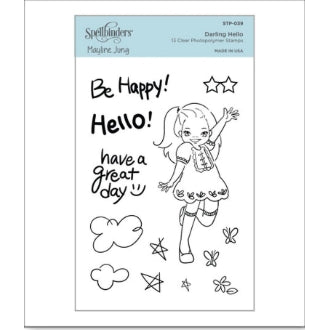Darling Hello Clear Stamp Set is part of the Delightful Darlings Collection by Mayline Jung. There are 13 clear Photopolymer stamps in the set. They are designed to work with an acrylic block and are made in the U.S.A. Images include a little girl waving, stars, flowers, leaf, butterflies, and puffy clouds. Three sentiments are: have a great day, hello and be happy.