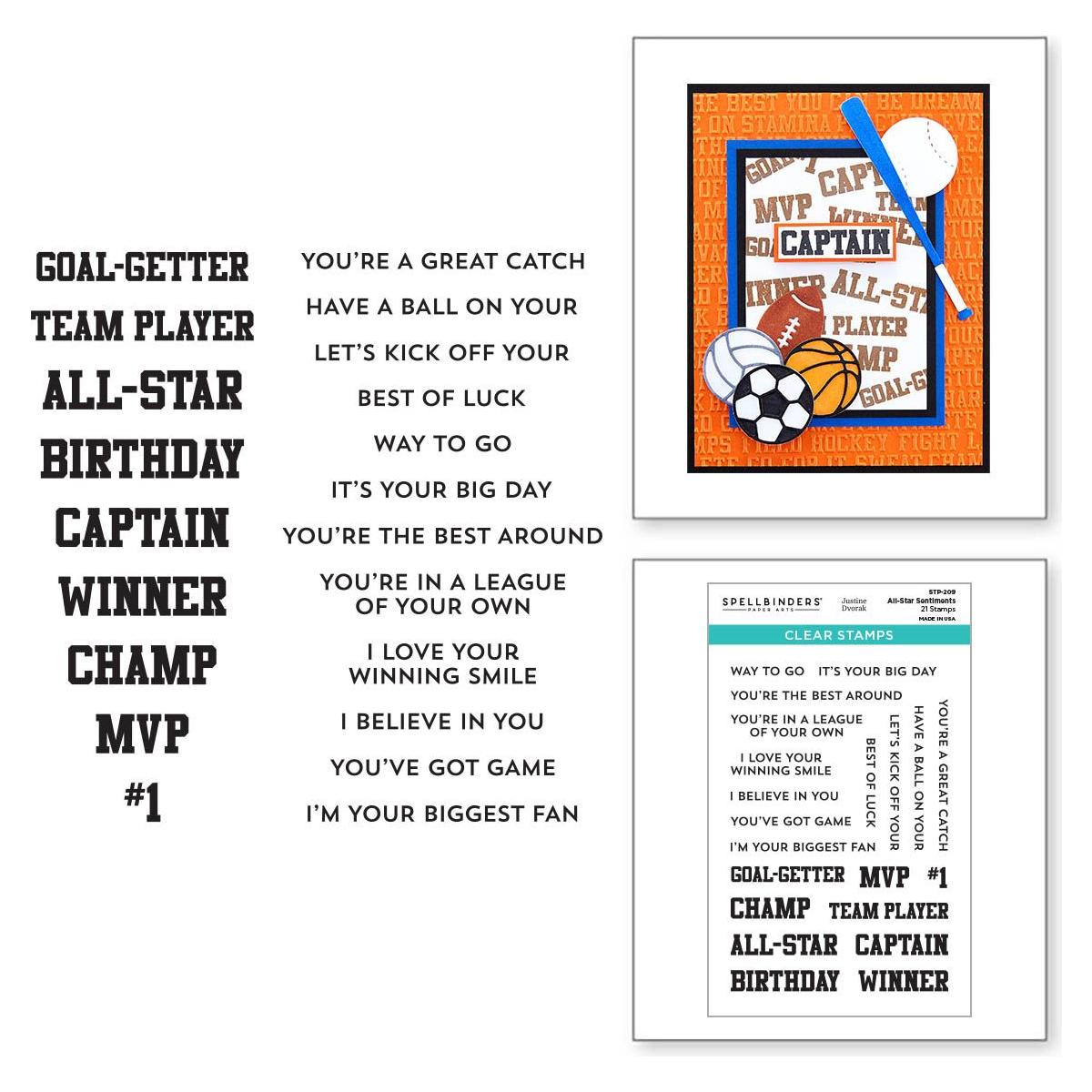 The All-Star Sentiments Clear Stamp Set is a fantastic addition to the Game Day Collection by Justine Dvorak, in collaboration with Spellbinders. This set includes 21 sentiment stamps, offering a wide variety of encouraging phrases and subtitles to choose from. You can mix and match these stamps to customize your sentiments for various sports-themed projects. These stamps are designed to work with an acrylic block and are proudly made in the USA.