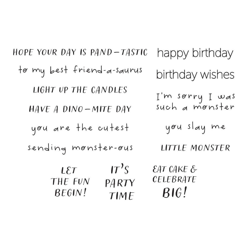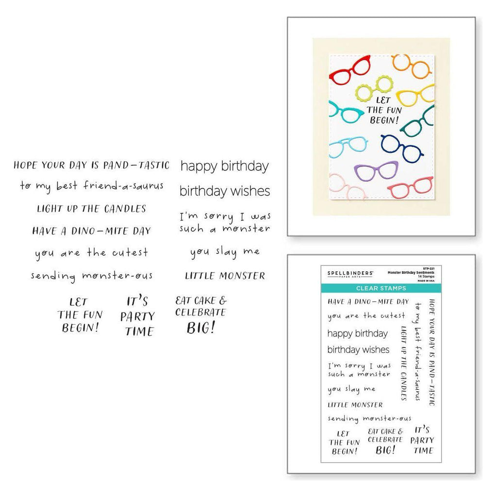 The Spellbinders Monster Birthday Sentiments Clear Stamp Set, part of the Monster Birthday Collection, offers a set of 14 clear stamps filled with funny puns related to all things monster and birthday. These whimsical sentiments are perfect to pair with any of the die sets in the Monster Birthday Collection, allowing you to create adorable and playful projects. These stamps are designed to work with an acrylic block and are proudly made in the USA.