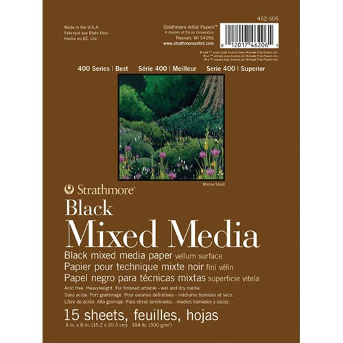 Medium drawing surface with the wet media characters of a watercolor sheet. Heavyweight, 184 lb (300g). Appropriate for finished artwork. Excellent for graphite, colored pencils, markers, acrylic, watercolor, gouache, pen & ink, charcoal, gel pens and more. Available in white, toned, and now black. Acid free and made in the USA. Black paper. Glue bound. 15 sheets per pad.