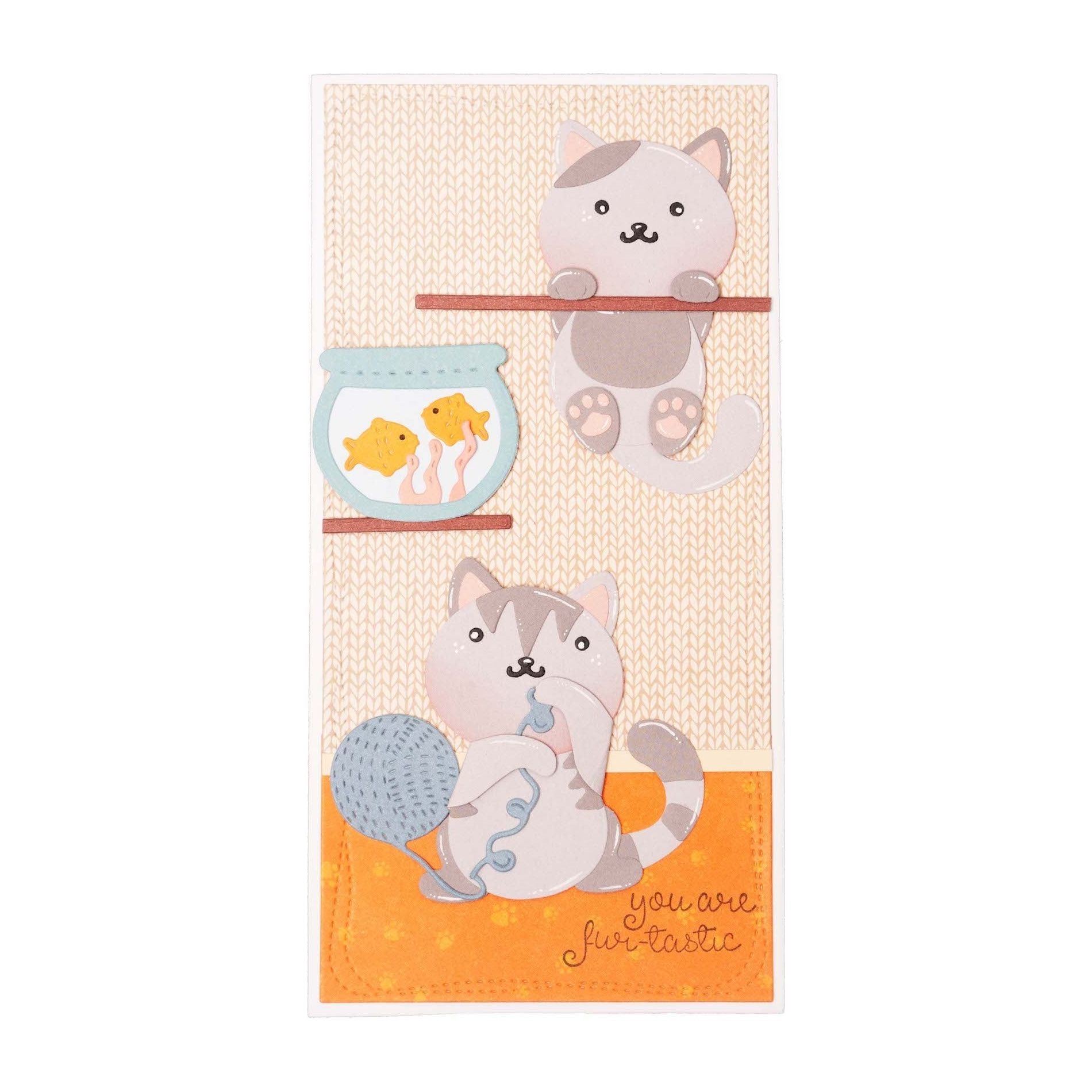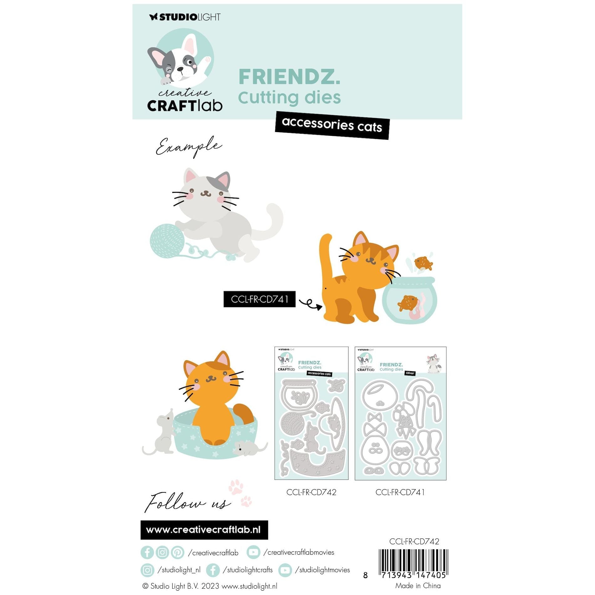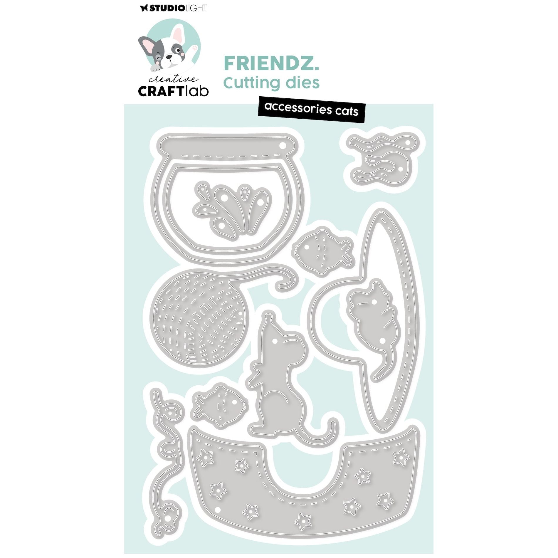 Part of the Creative Craftlab Collection designed by Jolanda Bergmans, the Studio Light Accessories Cats Friendz Dies complement the Oliver Friendz Dies ccl-fr-cd741 perfectly. This set, measuring approximately 5.5 x 4 inches, includes 12 wafer-thin dies featuring various cat accessories. Among these dies are elements to create a cat bed with stars, a ball of yarn, 2 mice, a fishbowl with fish, coral, splashes, and additional mice. These dies offer a fantastic way to enhance your cards, scrapbook layouts, and journal pages with charming cat-themed elements.