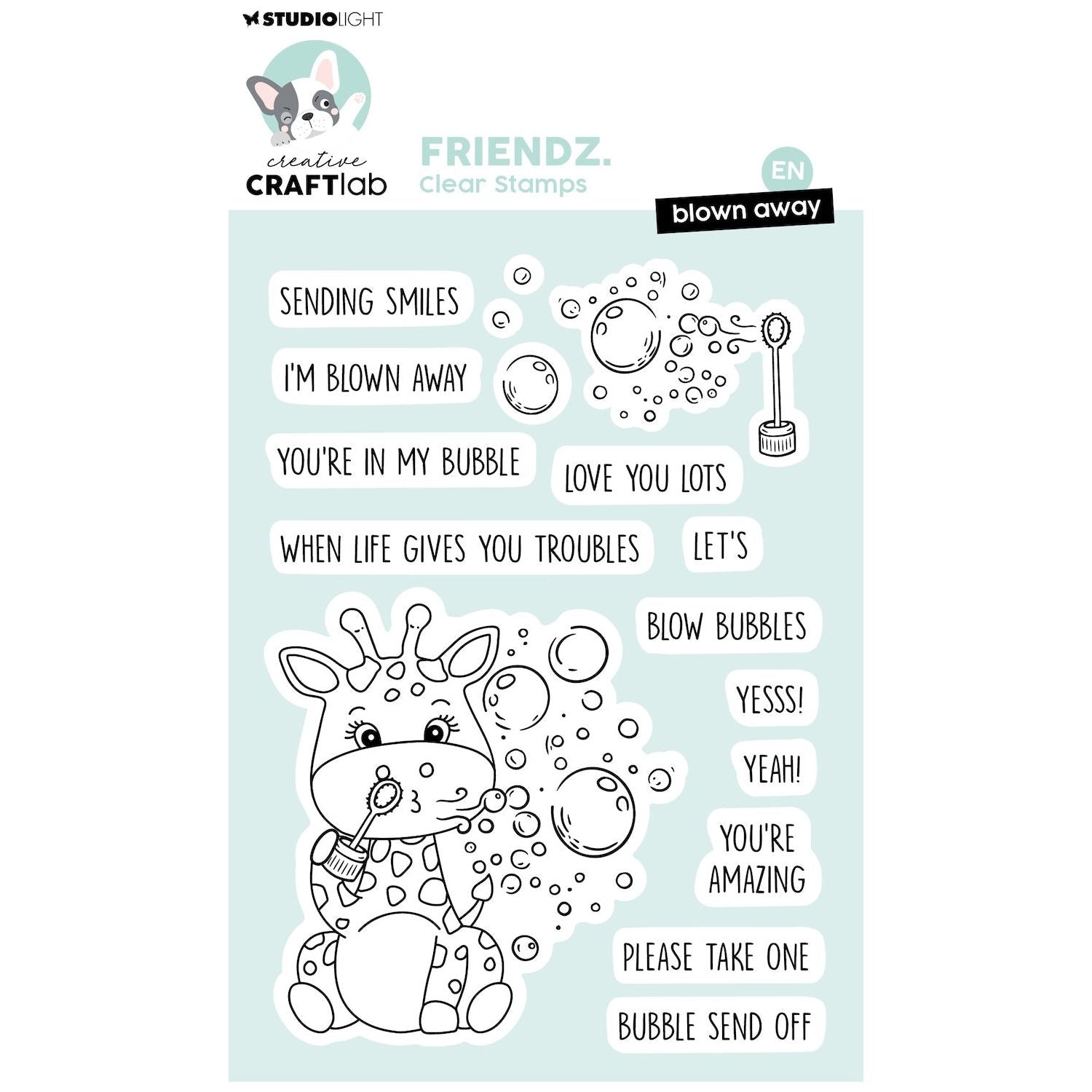 Studio Light Blown Away Friendz Clear Stamps, part of the Creative Craftlab Essentials Collection by Jolanda Bergmans, is a playful 2.3 x 5.5 inch (5.8 x 14 cm) clear polymer stamp set that includes 17 pieces. This set features a fun bubble wand, a charming giraffe blowing bubbles, and a variety of bubble-themed sentiments and words perfect for cheerful projects.