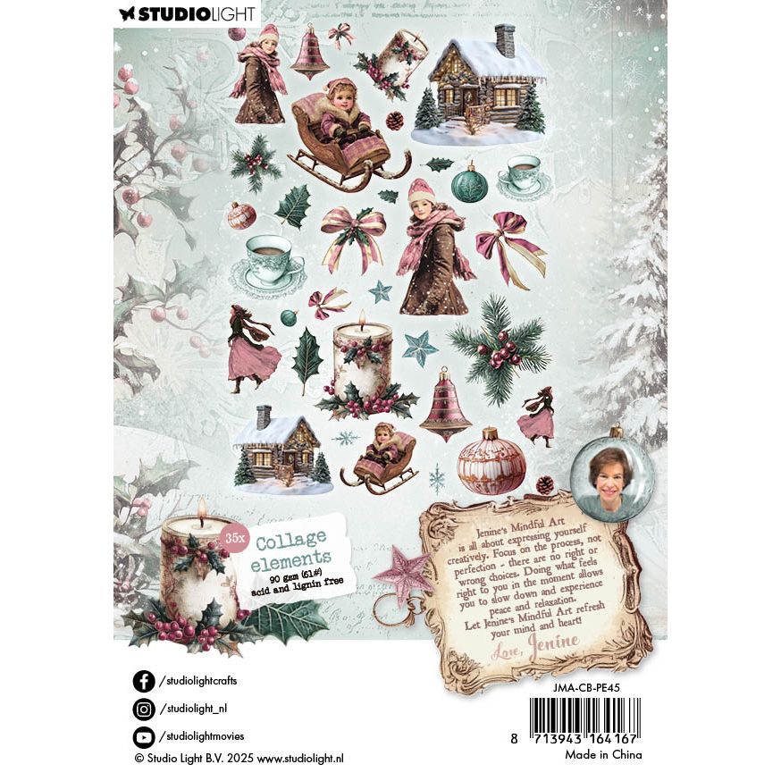 Studio Light Christmas Blush Collage Paper Elements, from Jenine's Mindful Art Christmas Blush Collection, includes 35 beautifully detailed die-cut pieces with a vintage holiday feel. The ephemera set features classic seasonal imagery such as women in winter attire, babies, holly, ornaments, a snowy cabin, candles, bells, bows, cups of tea, stars, and pine sprigs. Perfect for layering on Christmas and winter cards, scrapbook layouts, and journal pages, these elements add warmth and charm to any festive project.