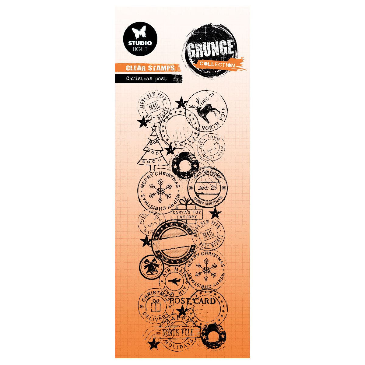 Studio Light Christmas Post Clear Stamp is part of the Grunge Collection and captures a layered, vintage holiday aesthetic. This single clear polymer stamp measures approximately 2 x 5.7 inches and features a collage of Christmas-themed postage designs, including trees, gifts, stars, bells, and more. Perfect for adding texture and festive detail to cards, tags, journals, and mixed-media projects.