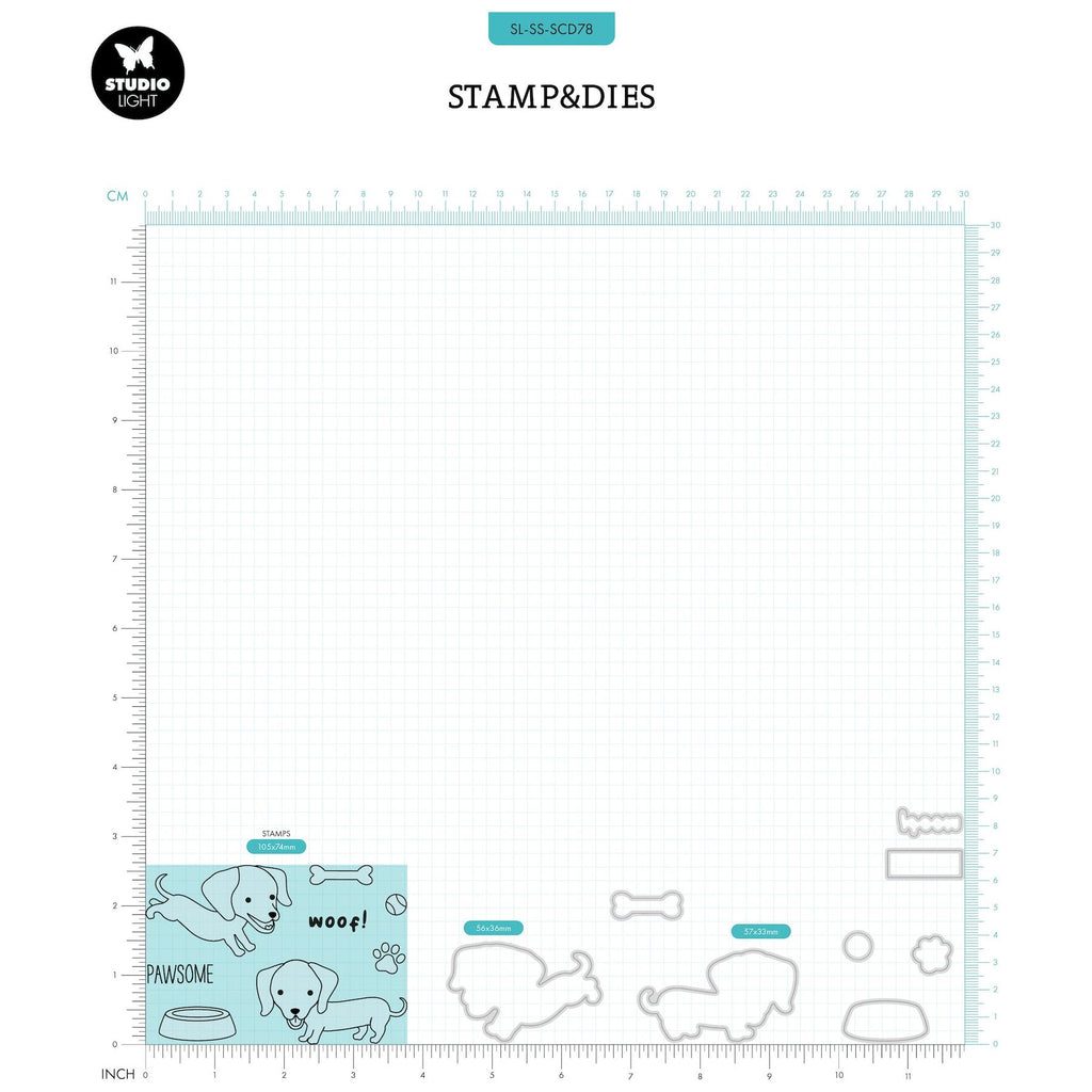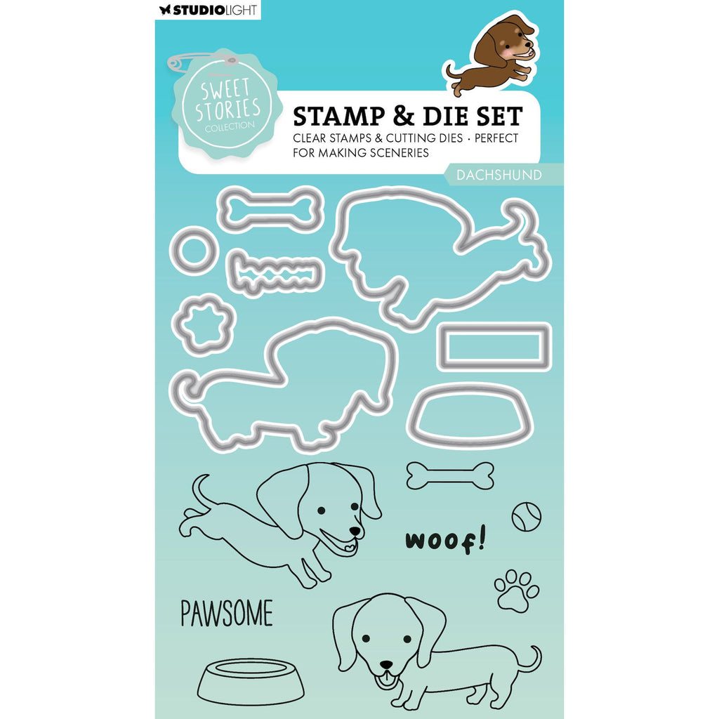 The Studio Light Dachshund Stamp & Die Set, part of the Sweet Stories Collection, features charming elements perfect for animal-themed projects. This set includes two delightful Dachshunds, a bone, a tennis ball, a bowl, and a paw print. It also includes fun sentiments like "Woof!" and "Pawsome." The set comprises 8 polymer stamps and 8 coordinating wafer-thin dies. The largest dog stamp measures approximately 2.2 x 1.4 inches, while the smallest dog stamp is around 2.2 x 1.3 inches. This versatile set is ideal for building scenes in scrapbooking, mixed media, journaling, and card making, and is suitable for use with all die-cutting machines.