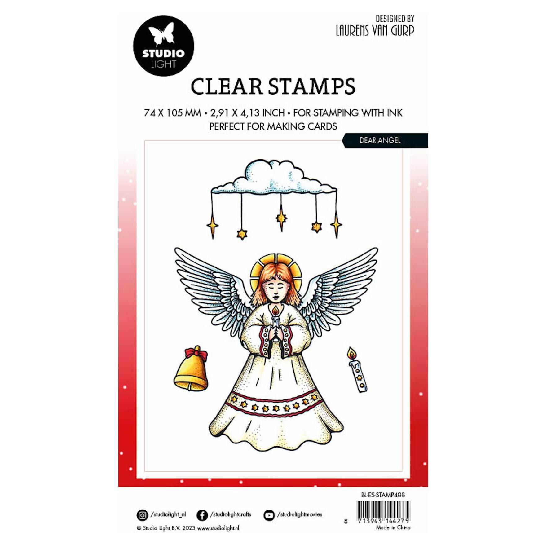 The Studio Light Dear Angel Clear Stamps are a lovely set designed by Laurens Van Gurp. This 4 x 3 inch clear, polymer stamp set includes four pieces. The stamps feature an angelic theme, making them perfect for holiday projects or other occasions that celebrate angelic symbolism. The focal point of the set is an angel with a halo and wings, exuding a sense of grace and celestial beauty. The angel stamp can serve as a centerpiece or a main element in your designs. Alongside the angel, the set includes additional stamps such as a bell, a lit candle, and a cloud with a hanging star. These elements complement the angel stamp and can be used to enhance your creative compositions.