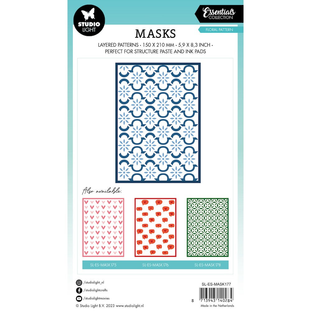 The Studio Light Floral Pattern Essentials Mask is a crafting tool that allows you to create stunning floral backgrounds for your cards, mixed media projects, journals, and other crafts. By using this mask with your favorite inks, dies, paints, and pastes, you can create beautiful designs that will enhance your projects. Made from sturdy plastic, this mask is easy to clean and can be reused multiple times, ensuring its longevity. With two sides to choose from, you can layer designs or use each side individually, allowing for creative flexibility. The stencil measures approximately 5.91 x 8.27 inches, providing ample space to craft unique designs. When layered, the flowers create a Moroccan background that adds an exotic touch to your creations.