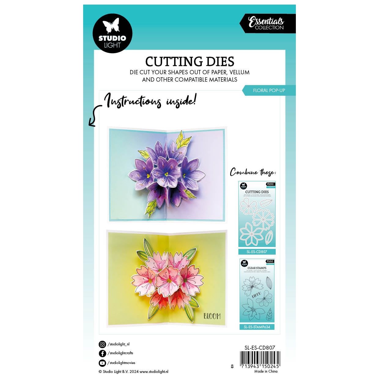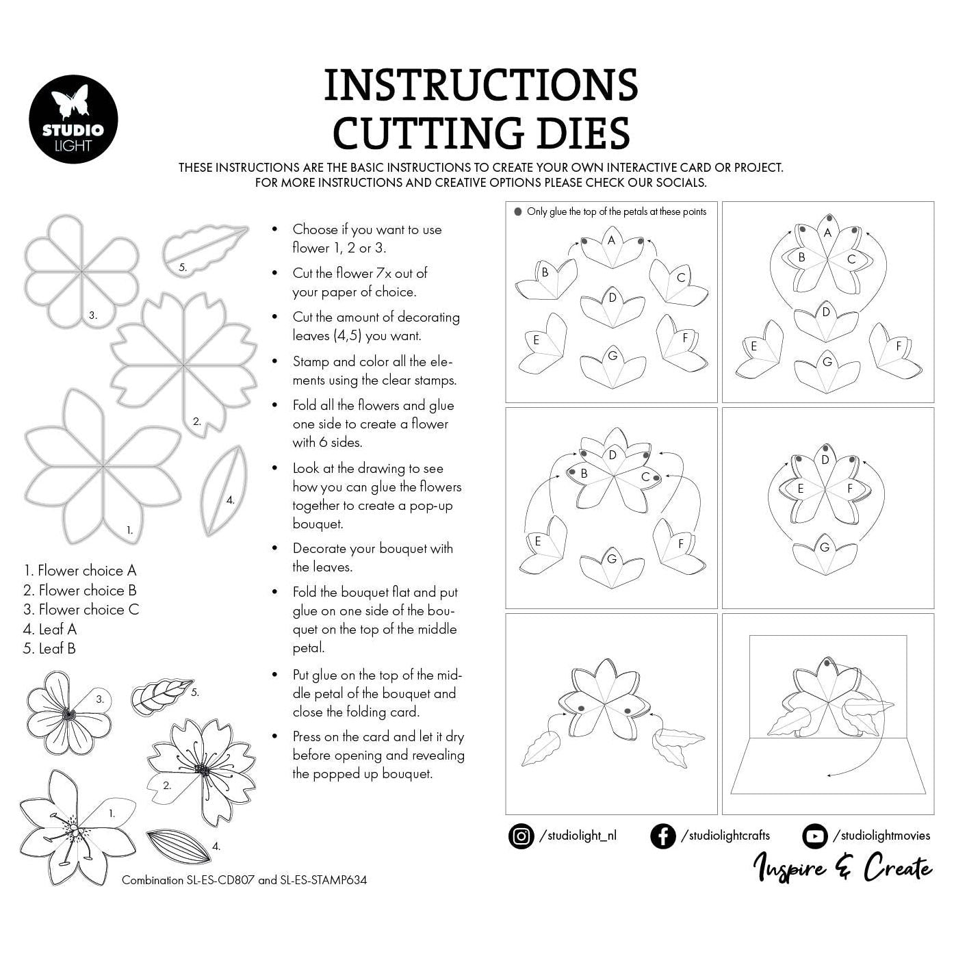 The Studio Light Floral Pop-Up Dies, an essential component of the Essential Collection, facilitates the creation of pop-up flowers, ideal for interactive card designs. This set is designed to be combined with the Floral Pop-Up Stamp set (sl-es-stamp634) to enhance your floral arrangements. Measuring 4 x 6 inches, this wafer-thin die set comprises 5 pieces, including three flower blooms and two leaves. These dies enable you to effortlessly incorporate the pop-up mechanism into your floral designs, resulting in captivating and engaging creations.