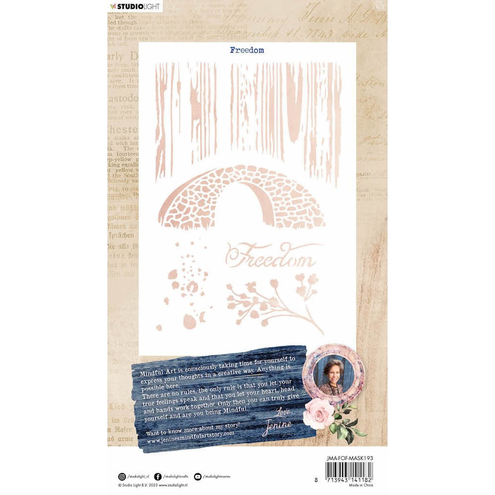 The Studio Light Freedom Mask is a versatile tool that can help you create beautiful borders and backgrounds for your cards, mixed media projects, journals, and more. This mask is a part of the Feelings of Freedom line within Jenine's Mindful Art Collection, featuring depictions of flowers on a twig, a country rock bridge, woodgrain texture, splotches, and the word Freedom. Made of strong plastic, the masks are easy to clean and reusable. The stencil measures approximately 5.83 x 8.27 inches, providing ample space to create stunning designs. By using your favorite inks, dies, paints, and pastes with this mask, you can add a unique touch to your creative projects while expressing your feelings of freedom.