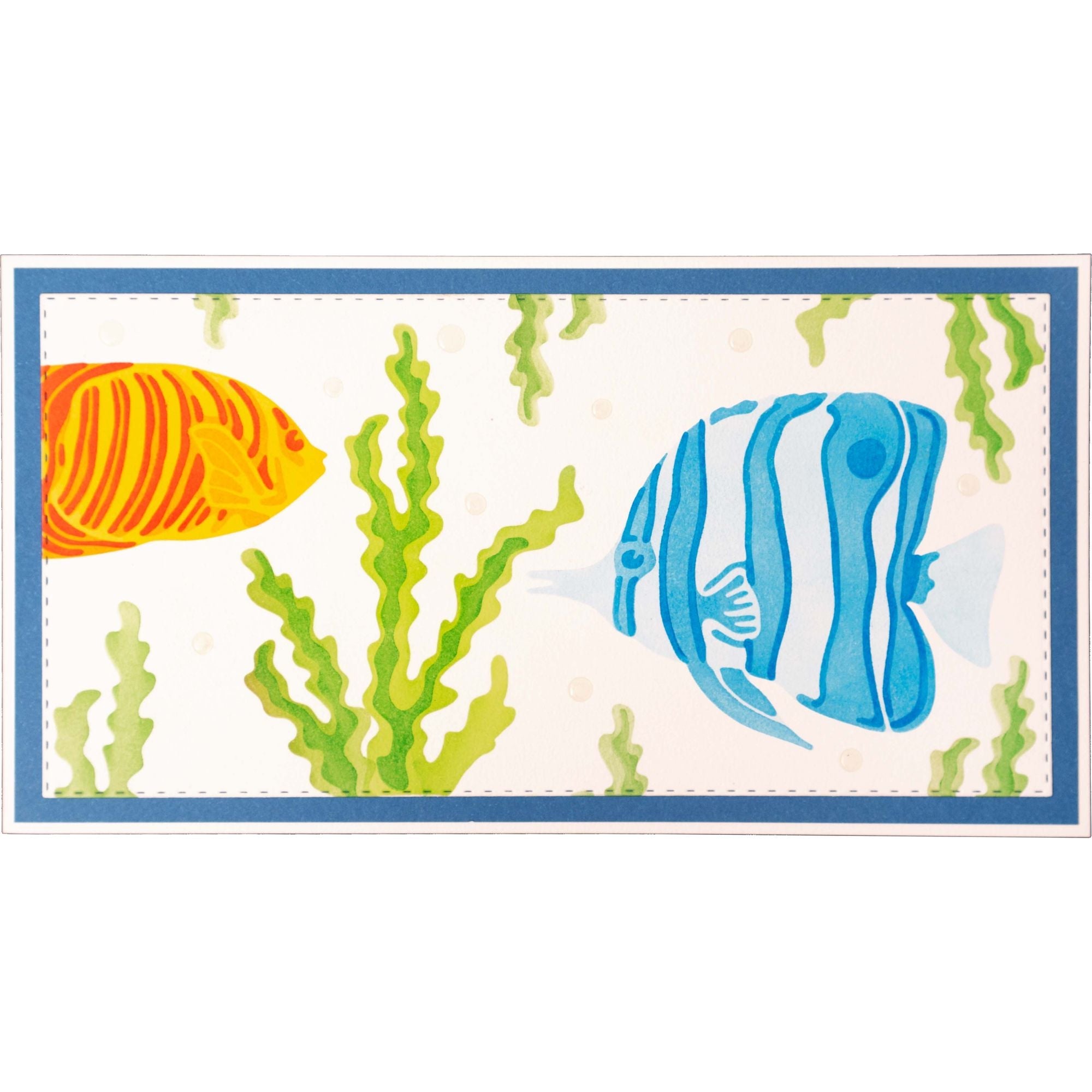 The Studio Light Ocean Fish Stencil is a delightful tool for your artistic endeavors. Measuring approximately 5.9 x 8.3 inches, this stencil is perfectly suited for paste and ink techniques. It features three charming fish designs, each accompanied by three distinct backgrounds that can be layered onto them, enabling you to create mesmerizing striped patterns that add depth and visual interest. Additionally, the stencil includes two seaweed elements that can be layered in different colors, enhancing the dimensionality of your artwork. Embark on an underwater adventure and bring captivating marine scenes to life with ease.