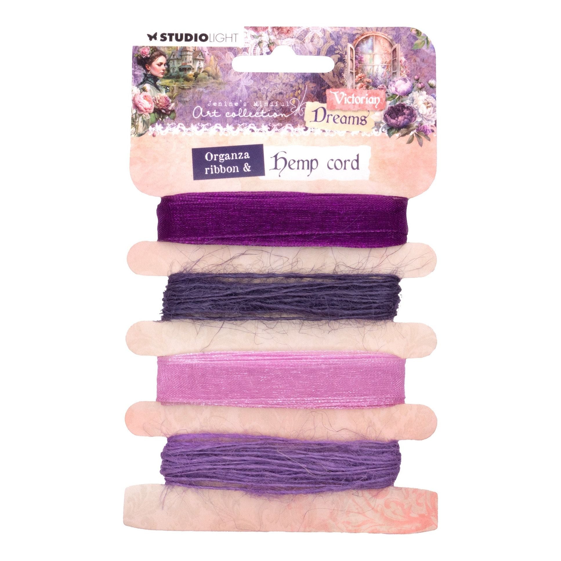Studio Light Organza Ribbon & Hemp Cord Purples are part of Jenine's Mindful Art Victorian Dreams Collection. In this 5.5 x 3.5-inch package, you'll find a delightful array of shades, offering a versatile palette for your creative projects. It features elegant organza ribbons in deep purple and pink, adding a touch of softness and sophistication to your designs. Additionally, the package includes durable hemp cords in dark purple and lavender, providing both texture and durability to your crafting endeavors.