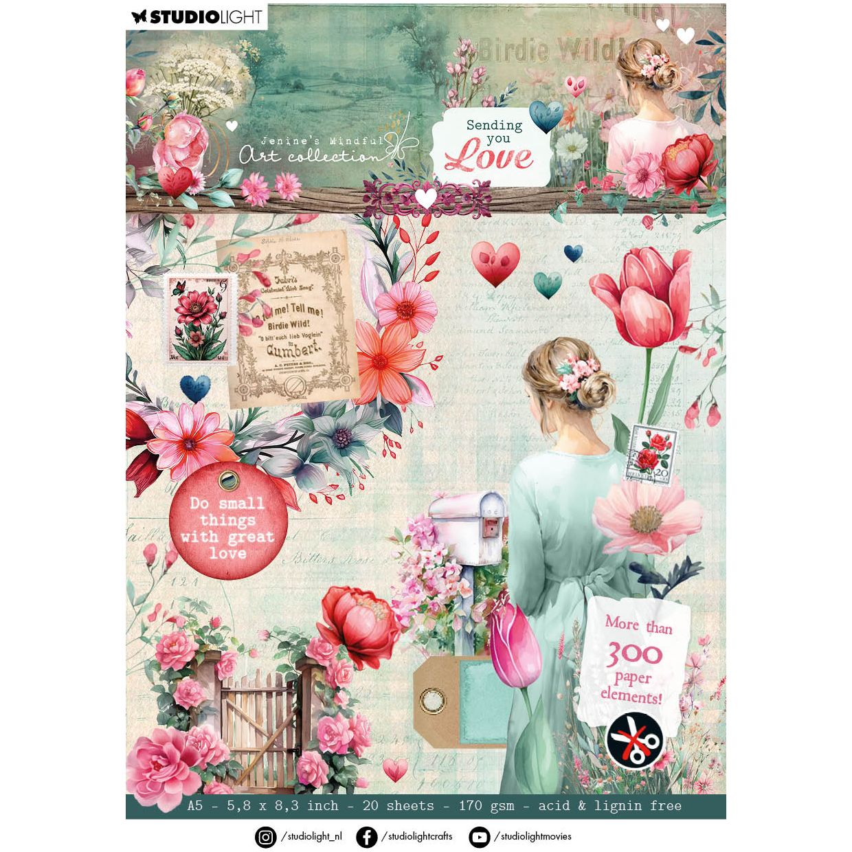 The Studio Light Sending You Love Die-Cut Paper Elements Pad, part of Jenine's Mindful Art Collection, is a versatile addition to your creative projects. This handy book includes 20 sheets with over 300 pre-cut paper elements, printed on heavyweight 170gsm, acid-free cardstock. Designed to complement the rest of Jenine's Sending You Love collection, these elements can also be used on their own for scrapbooking, mixed media, journaling, and card making. Measuring approximately 5.8 x 8.3 inches, this pad features ephemera including flowers, girls, wreaths, foliage, postage, café scenes, hats, bouquets, tags, wildflowers, and more—perfect for adding charming details to your projects.