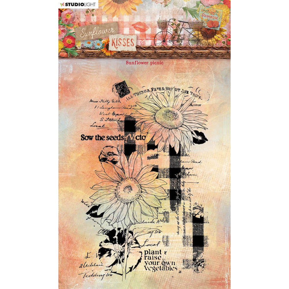 Get inspired to create with the Studio Light Sunflower Picnic Clear Stamp from the charming Sunflower Kisses Collection! This stamp, measuring approximately 6 x 4.25 inches, features a delightful collage of sunflowers arranged atop a distressed picnic tablecloth. The stamp also includes inspiring phrases such as "Sow the Seeds" and "Plant and Raise Your Own Vegetables", making it perfect for adding a touch of nature-inspired charm to your projects.