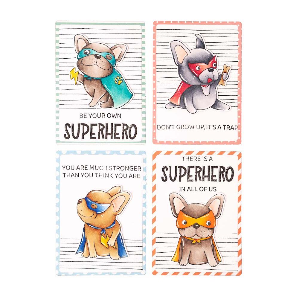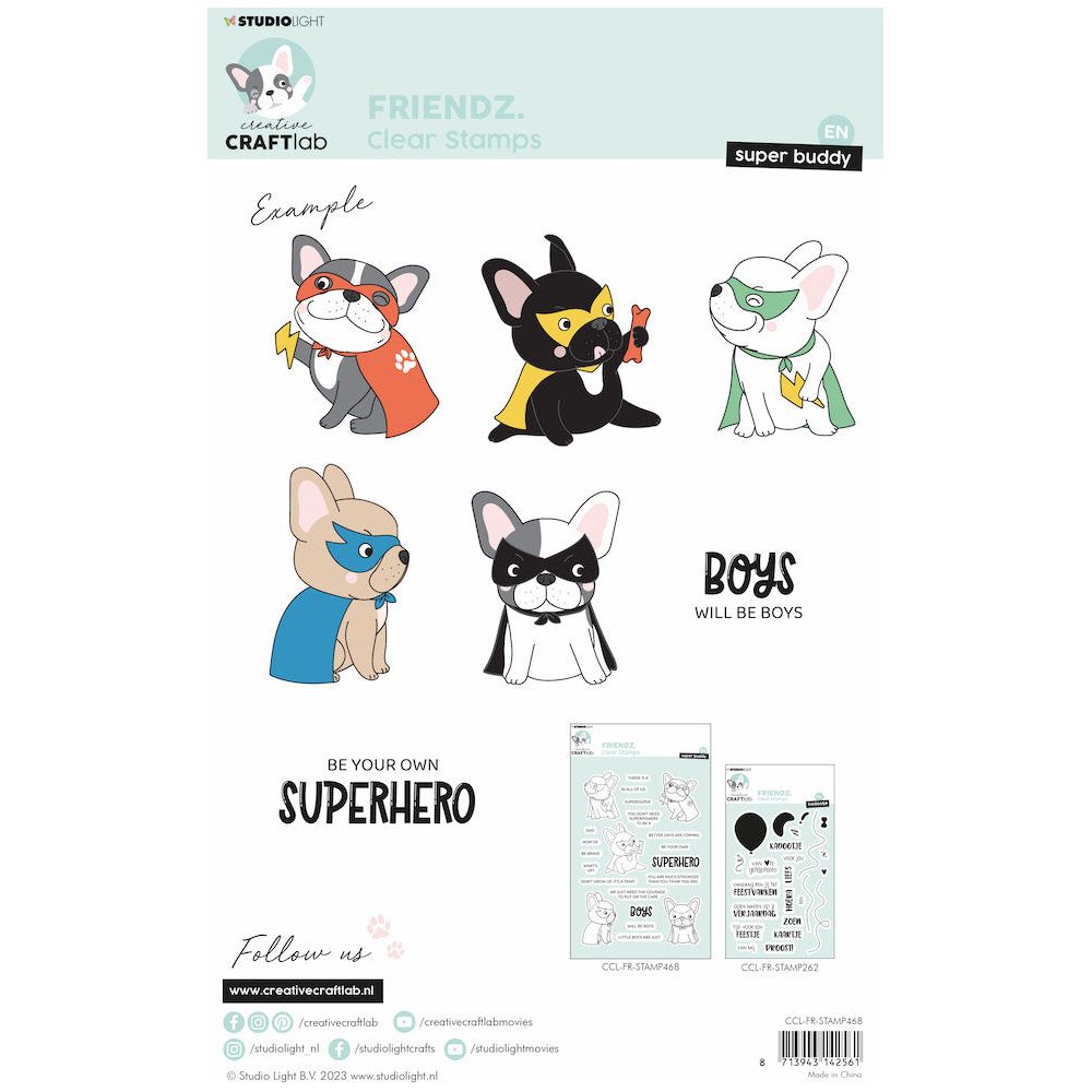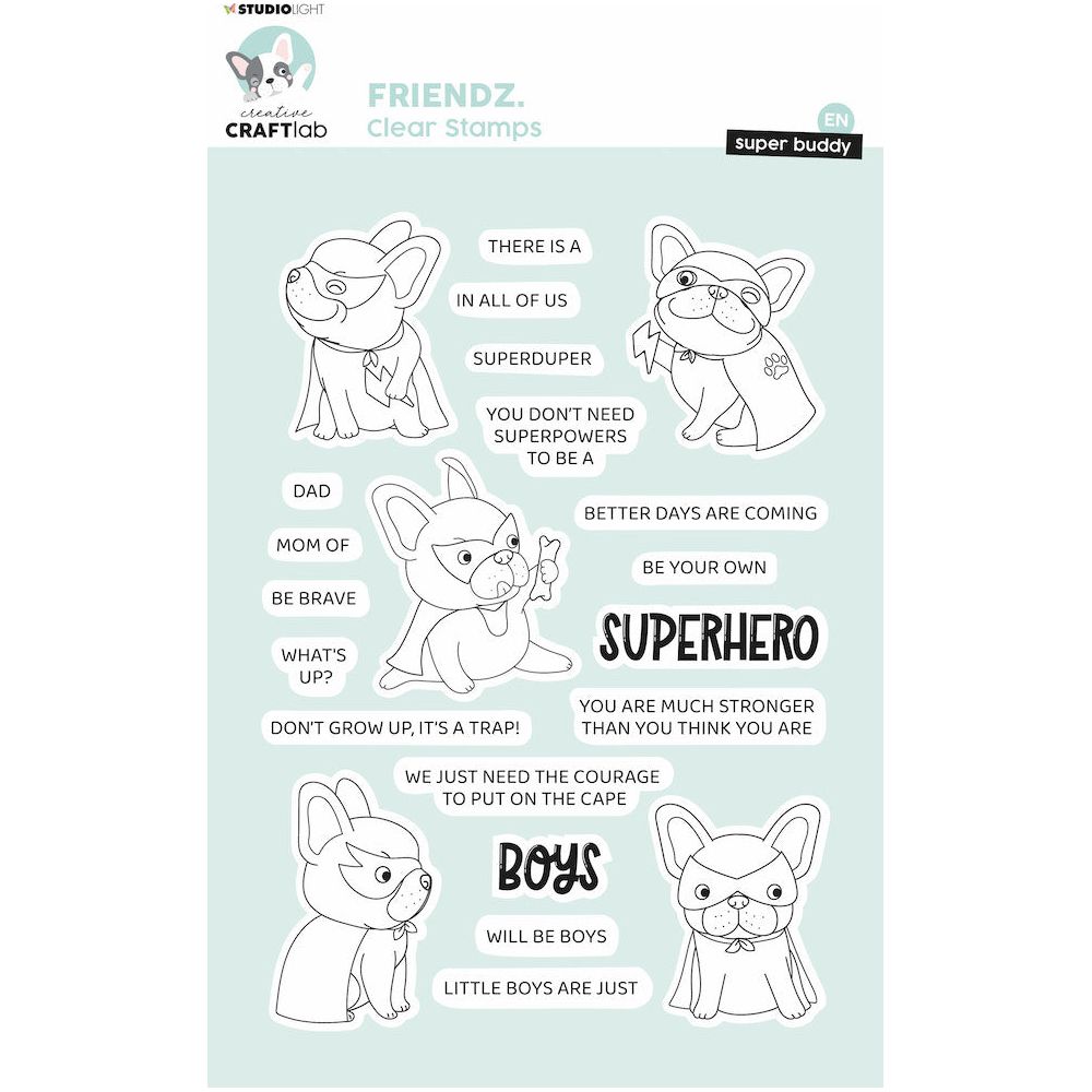 The Studio Light Superhero Buddy Clear Stamps is a part of the Creative Craftlab collection, designed by Jolanda Bergmans. This 8x6 inch clear polymer stamp set includes 22 pieces featuring Buddy the dog dressed in his superhero mask and cape, ready to save the day! The set includes Buddy in 5 different poses, some holding a lightning bolt or bone, along with a mix-and-match selection of words and phrases that can be used to create custom designs. The phrases include:
