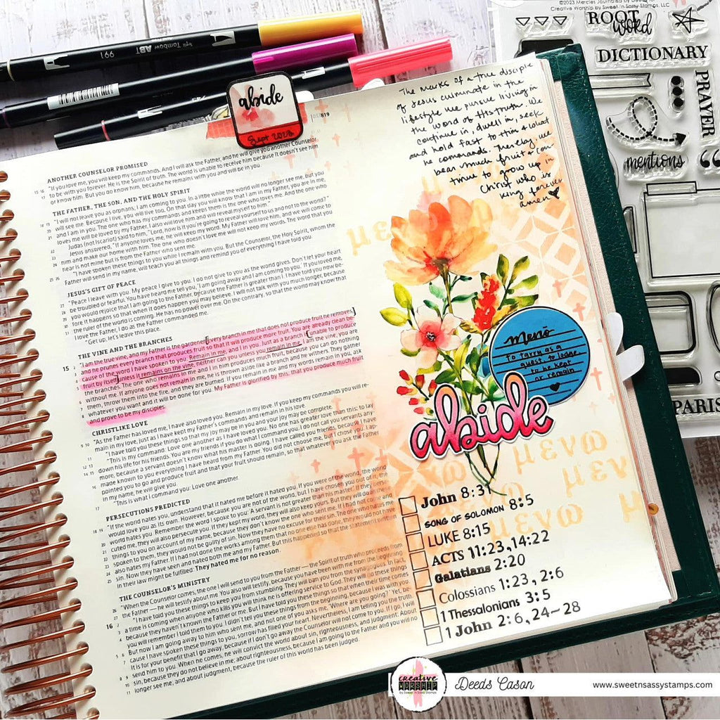 This Sweet 'N Sassy Books Of The Bible Clear Stamps set contains 77 stamps printed on top-quality, clear photopolymer and measuring 4 x 6 inches. They are designed by Deirdre Cason and proudly made in the USA.