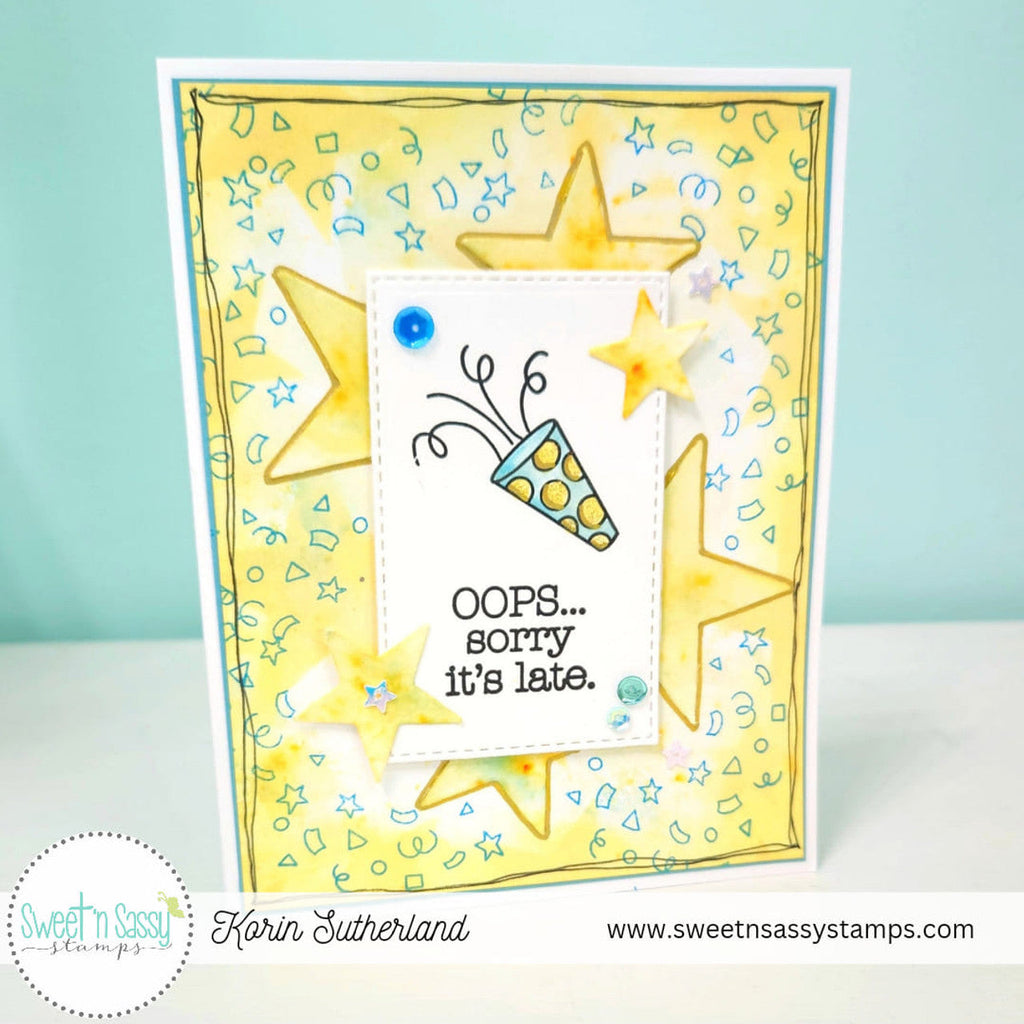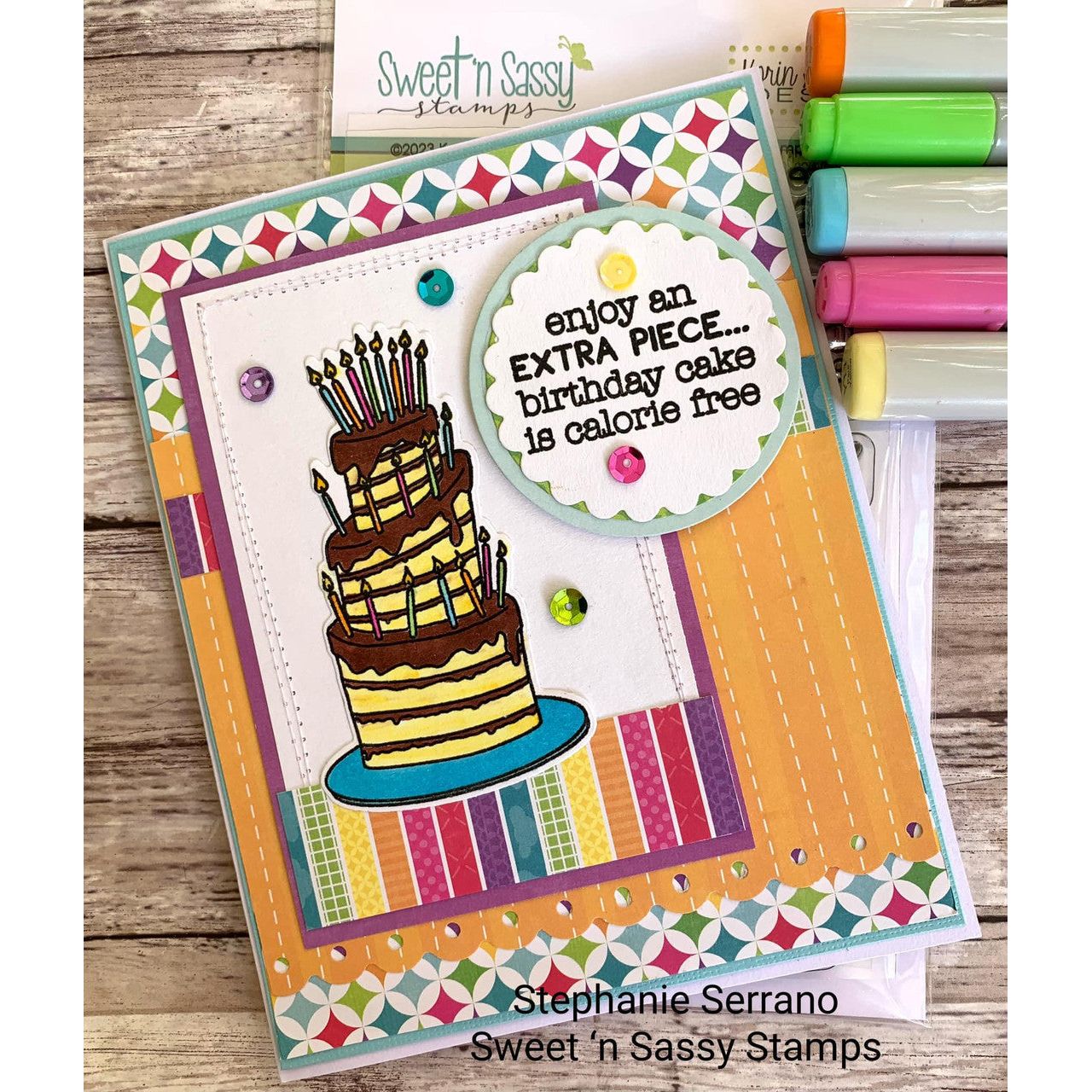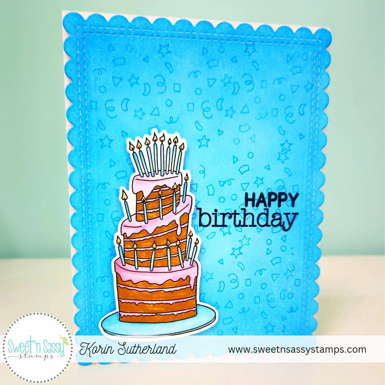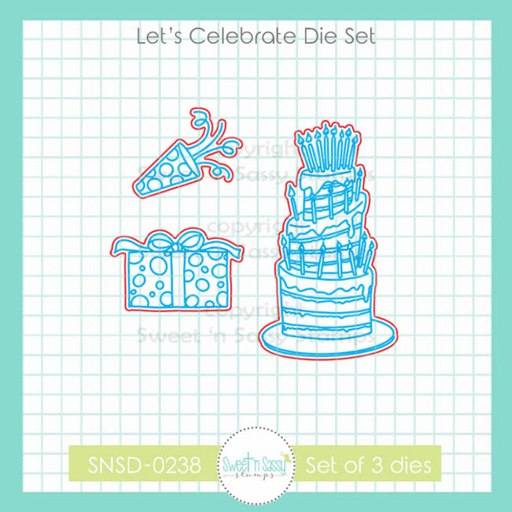 This die set works perfectly with the Let's Celebrate Stamp Set (sns-23-043). It includes 3 durable steel dies, each designed by Korin Sutherland and crafted in the USA. It features a festive layered cake, gift, and a celebratory party blower or confetti cannon.