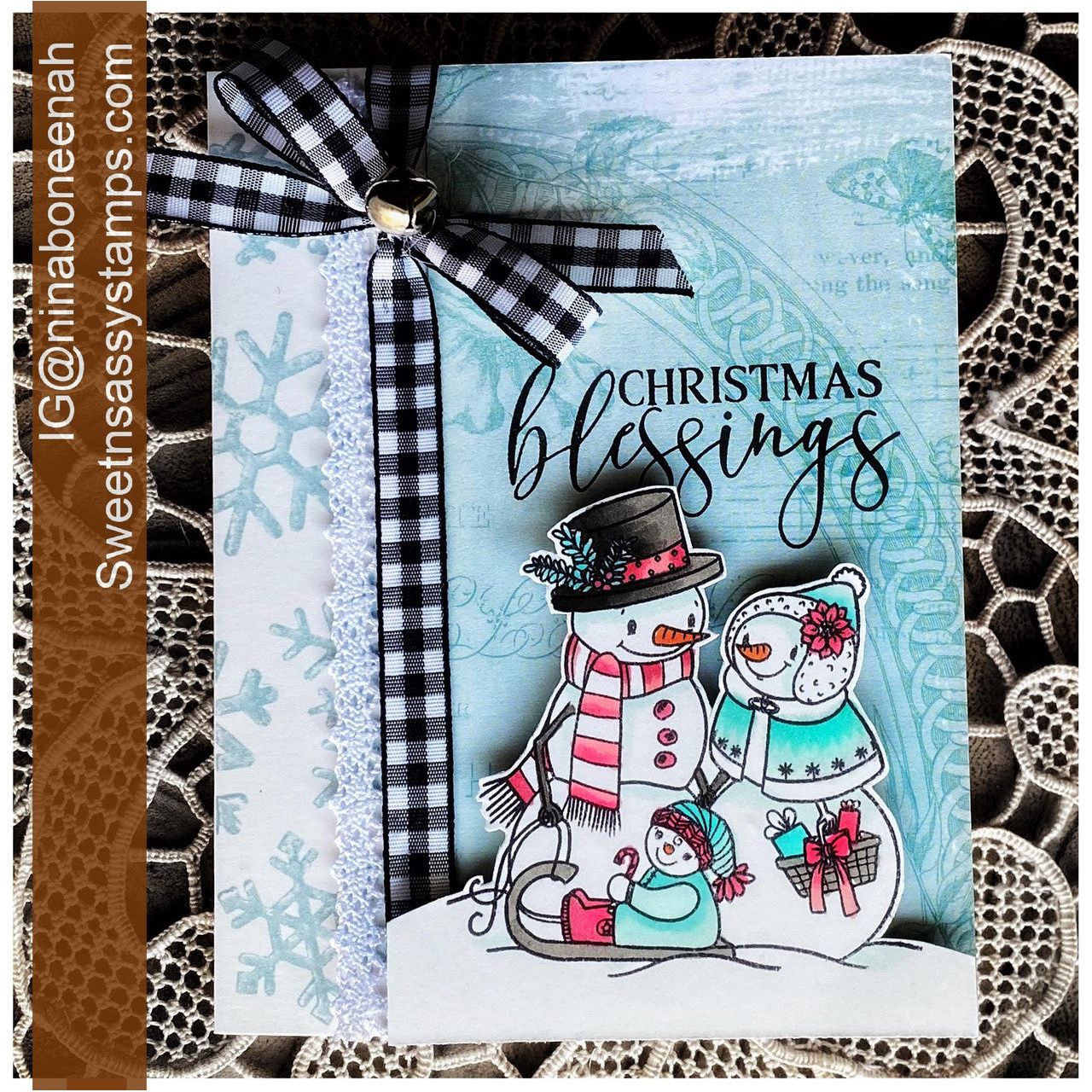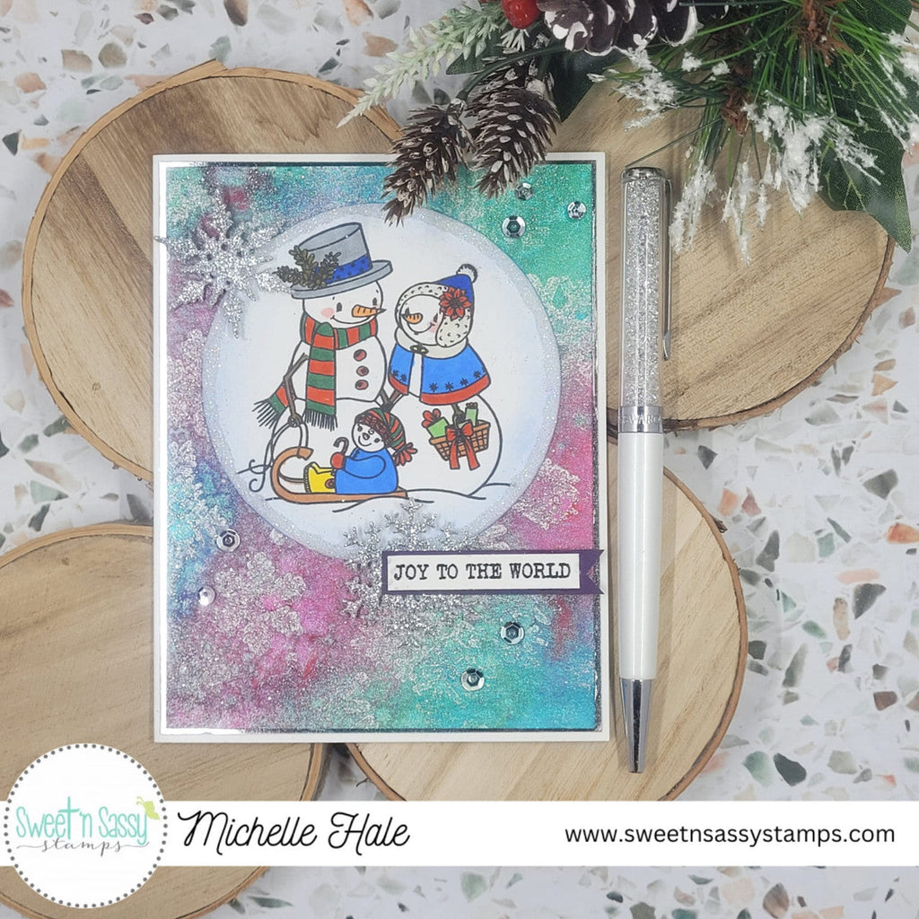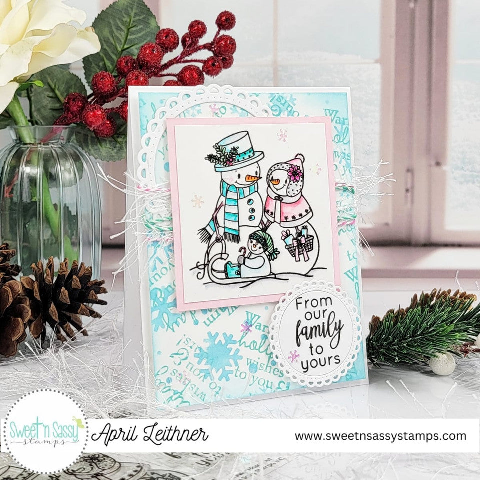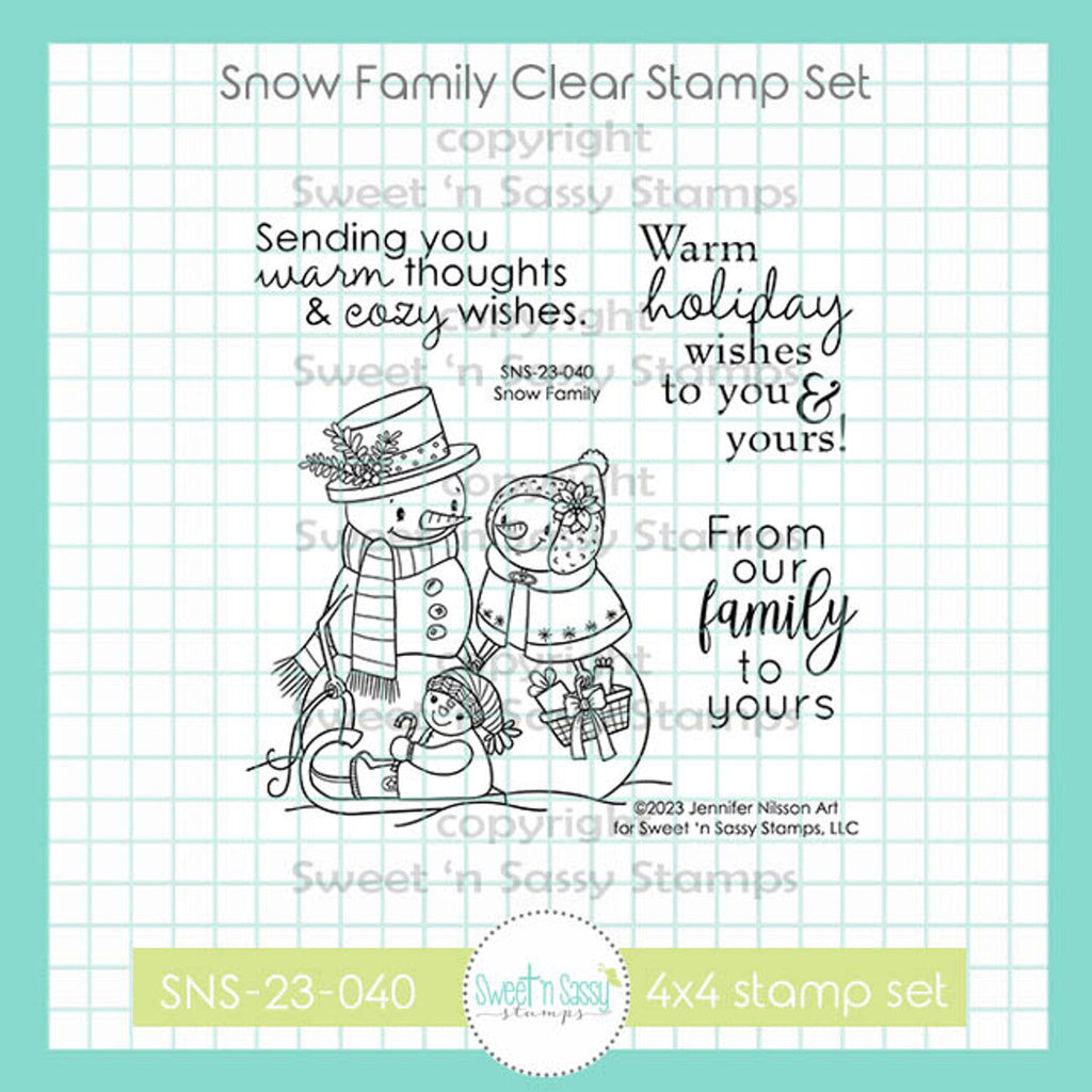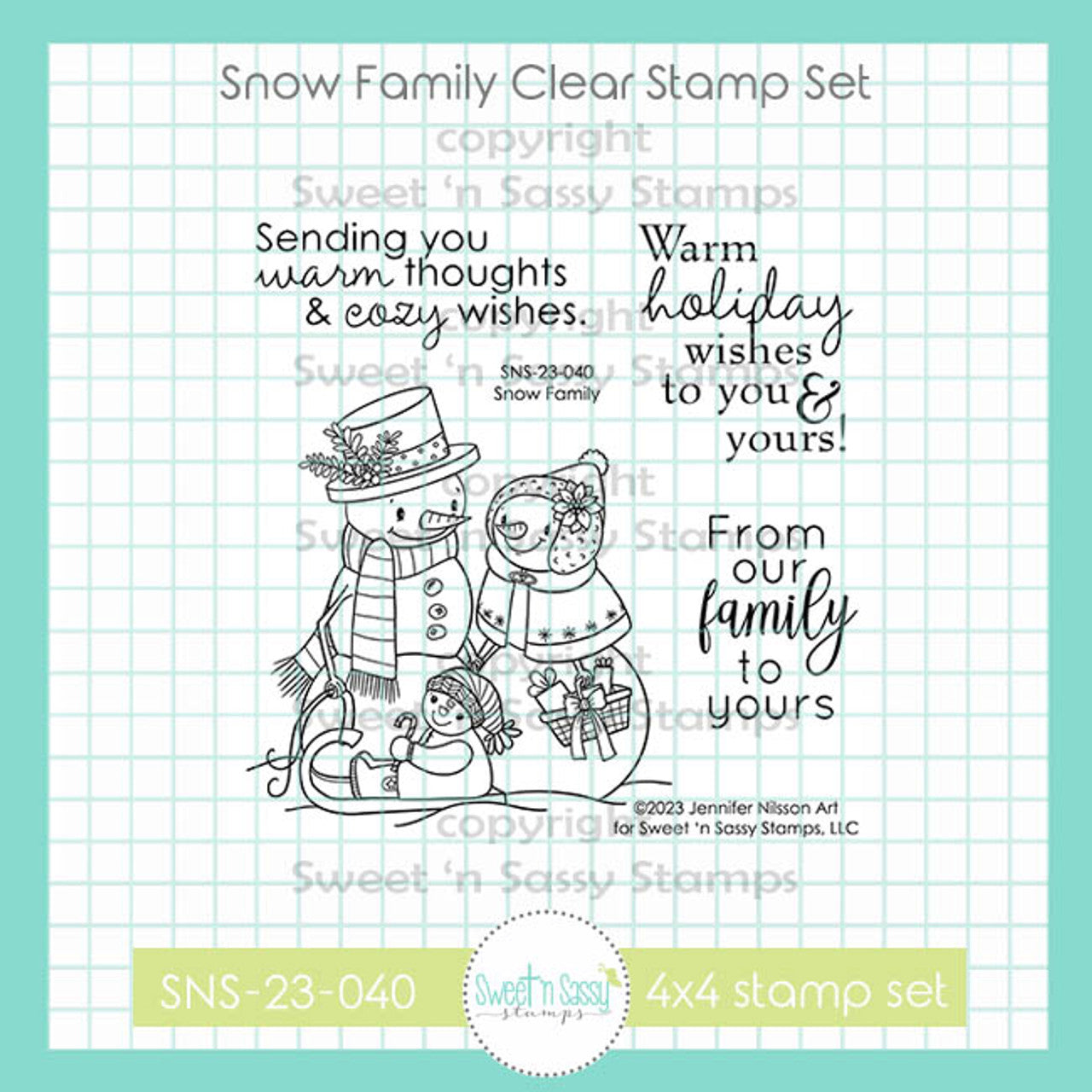 This set contains 4 clear stamps in a pack measuring 4 x 4 inches. Designed by Jenn Nilsson, these stamps feature a family of snowmen bundled up in winter attire, as well as a single snowman child on a sled. All stamps are made in the United States.